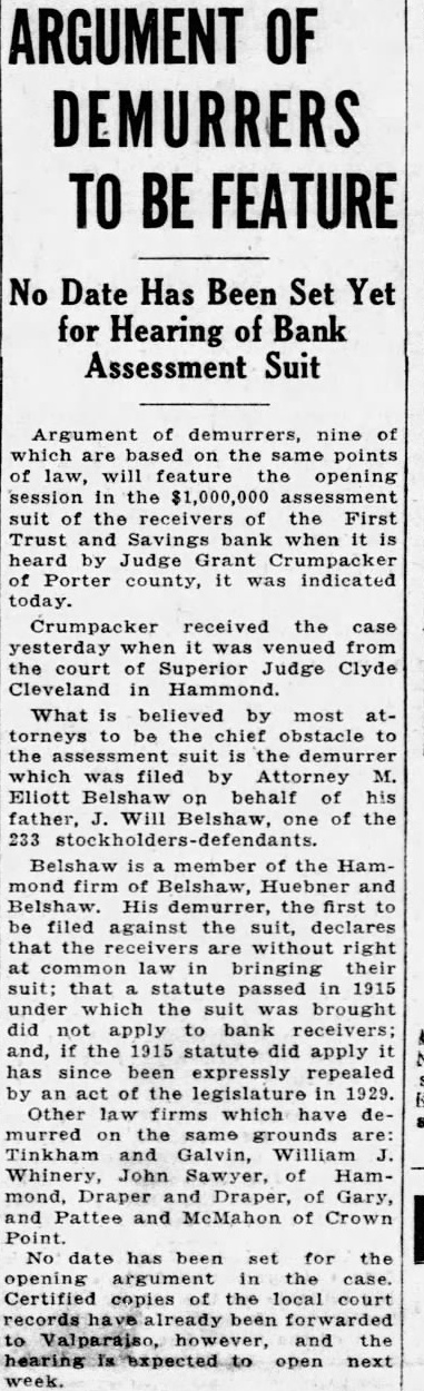 Argument of demurrers, of which based on the same points law, feature opening session in the $1,000,000 assessment the receivers the First Trust and Savings when heard by Judge Grant Crumpacker of Porter county, it indicated Crumpacker received the case yesterday venued from the court of Superior Judge Clyde Cleveland in Hammond. What is believed by most attorneys to be obstacle to which was by Attorney M. Eliott Belshaw behalf of his father, Will of the 233 Belshaw member of the Hammond firm of Belshaw, Huebner and Belshaw. His the first to be filed against the suit, declares that the receivers without right common bringing their suit; statute passed in 1915 under which the brought did not apply bank receivers; and, the statute did apply has since been expressly repealed by the legislature 1929. Other which same Tinkham Galvin, William Whinery, John Sawyer, Hammond, Draper Draper, of Gary, and Pattee and McMahon of Crown Point. No has set for the opening argument in the case. Certified copies the local court to Valparaiso, the open next