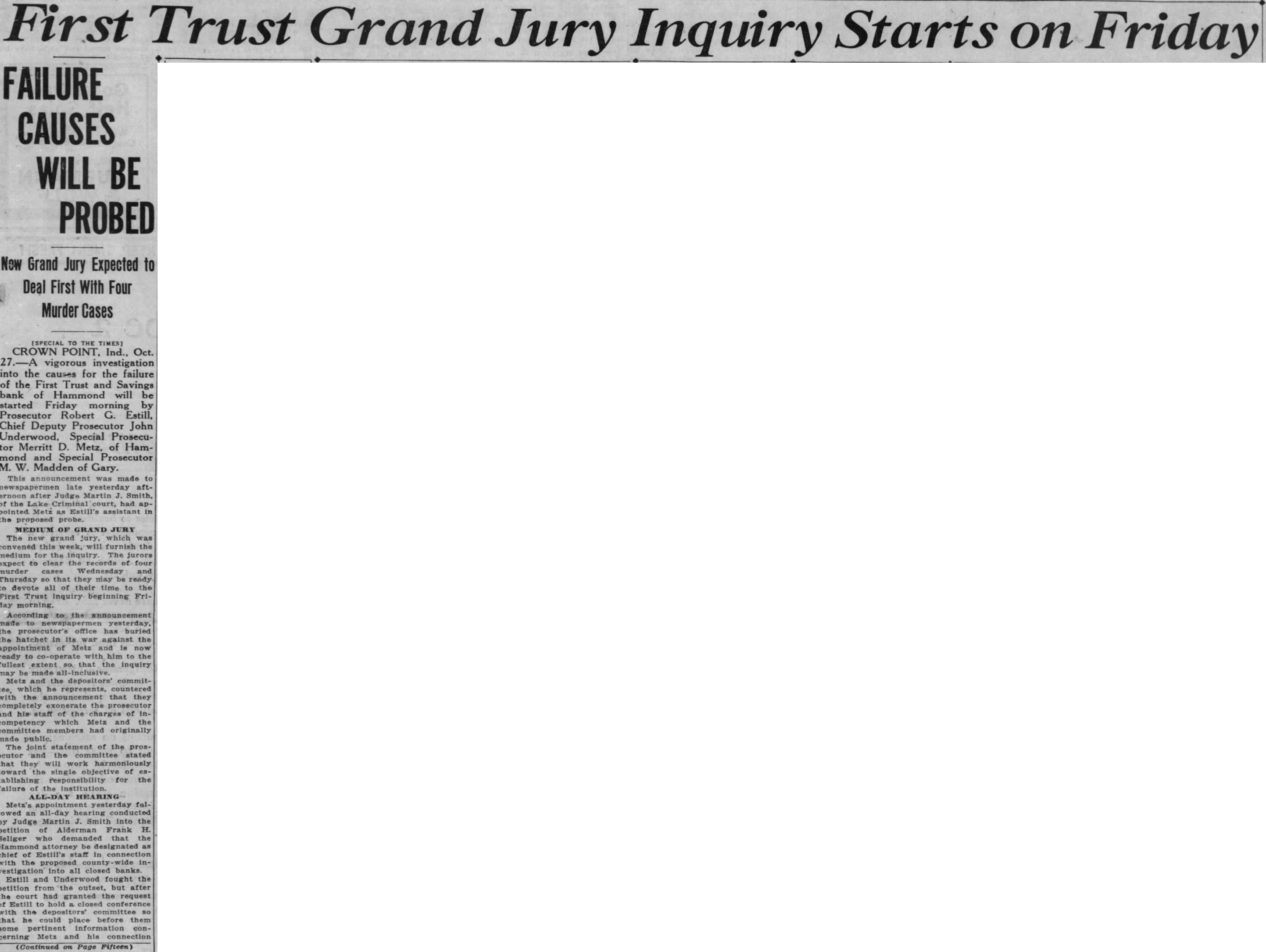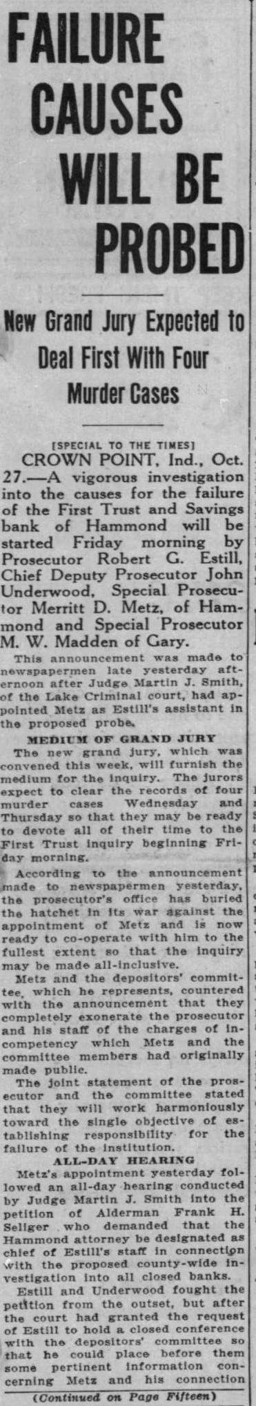 [SPECIAL TO THE TIMES) CROWN POINT, Ind., Oct. vigorous investigation into the causes for the failure of the First Trust and Savings bank of Hammond will be started Friday morning by Prosecutor Robert G. Estill, Chief Deputy Prosecutor John Underwood, Special Prosecutor Merritt D. Metz, of Hammond and Special Prosecutor M. Madden of Gary. This was made late yesterday after Judge Martin Smith, of the Lake had pointed Metz as Estill's assistant in the proposed probe. MEDIUM OF GRAND JURY The jury, which this furnish the medium the expect to clear the four murder cases Thursday they may be devote of time to the Trust inquiry beginning Frimorning. According the announcement the prosecutor's office buried hatchet in against the Metz is ready to with him to the fullest extent that the inquiry made Metz and the depositors' commitwhich he represents, the announcement that they the and his staff of the of inwhich the competency committee had originally The joint statement of the prosecutor stated that work harmoniously toward the single of tablishing responsibility for the failure the ALL-DAY HEARING yesterday followed all-day conducted Judge Martin Smith into the of Alderman Frank petition Seliger that the be Estill's in chief the into all closed banks. Estill and Underwood fought the petition from the outset, but after the court had granted the request of Estill hold closed with the depositors' committee that he could before them pertinent information cerning Metz and his connection (Continued on Page Fifteen)