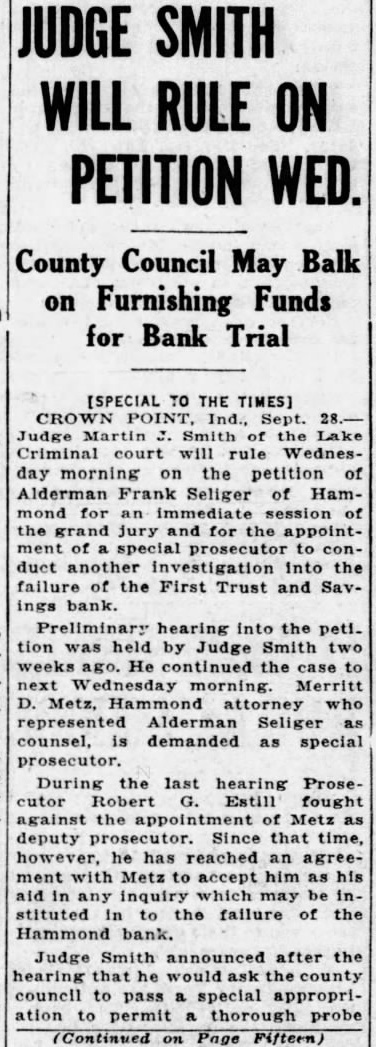[SPECIAL TO THE TIMES] Judge Criminal rule Wednesday morning the petition of Alderman Frank Seliger of Hammond session of for the special to duct another investigation Into the failure of the First Trust and Savbank. Preliminary hearing the peti. tion was held by Judge Smith two weeks He continued the case to Wednesday morning. Merritt Metz, Hammond attorney who represented Alderman Seliger counsel, demanded as special prosecutor. During the last hearing Prosecutor Estill fought against the Metz deputy Since that time, however, has reached an with Metz accept him his which instituted to the failure of the Hammond bank. Judge Smith announced after the hearing would council pass special appropripermit thorough probe (Continued on Page Fifteen)