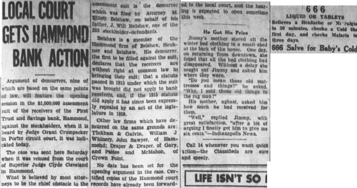 The case was sent here Saturday when It was venued from the court of Superior Judge Clyde Cleveland in Hammond. What is believed by most attorneys to be the chief obstacle to the assessment the demurrer ed to the local court, and the hearsuit is which was filed by Attorney M. ing is expected to open sometime this week. Elliott Belshaw, on behalf of his father, Will Belshaw, one of the 233 He Got His Price Belshaw is a member of the Jimmy's mother stored all the Hammond firm of Belshaw, Heub- winter bed clothing small shed ner at the back of the house. One day. and Belshaw. His on returning from downtown, the first to be filled against the sult, found that all the bed clothing had declares that the receivers are disappeared. Without delay she without right at common law in sought out Jimmy and asked him bringing their suit: that statute where they were. "Do you mean those old passed in 1915 under which the suit mattresses and things?" be asked. was brought apply to bank did not sold those old things to receivers, the 1915 statute if the man rag did apply it has since been express- His mother, aghast, asked him ly repealed by an act of the legis- how much he had received for them. lature in 1929. "Well," replied Jimmy, with Other law firms which have degreat satisfaction. "after lot of murred on the same grounds are: arguing finally got him to give me Tinkham & Galvin, William six cents. "-Indianapolls News. Whinery, John Sawyer, of Hammond; Draper & Draper, of Gary, Call 14 whenever you want quick and Pattee and MeMahon, of action-the Classifieds are sure Crown Point. and speedy. No date has been set for the opening argument in the case. Certifled copies of the Hammond court records have been forwardalready