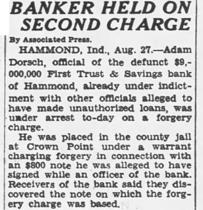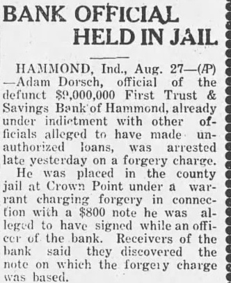 By Associated HAMMOND, Ind., Aug. 27.-Adam Dorsch, official of the defunct $9,000,000 First Trust & Savings bank of Hammond, already under indictment with other officials alleged to have made unauthorized loans, was under arrest to-day on a forgery charge. He was placed in the county jail at Crown Point under a warrant charging forgery in connection with an $800 note he was alleged to have signed while an officer of the bank. Receivers of the bank said they discovered the note on which the forgery charge was based.