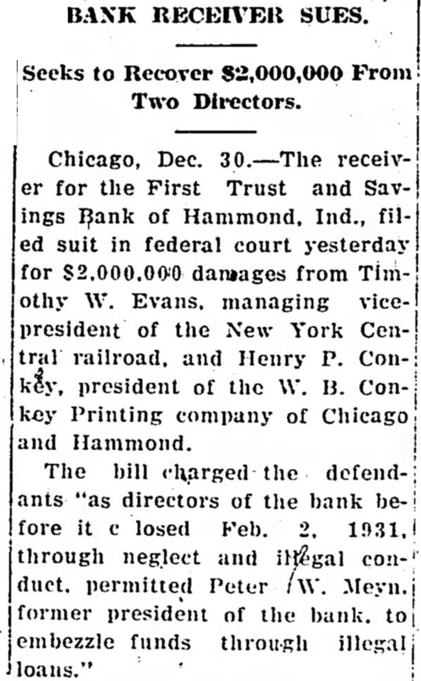 Chicago, Dec. 30.-The receiver for the First Trust and Savings Bank of Hammond, Ind., filed suit in federal court yesterday for $2,000,000 damages from Timothy W. Evans. managing vicepresident of the New York Central railroad, and Henry P. Conkey, president of the W. B. Conkey Printing company of Chicago and Hammond. The bill charged the defendants "as directors of the bank before it e losed Feb. 2. 1931, through neglect and illegal conduct. permitted Peter /w. Meyn. former president of the bank. to embezzle funds through illegal loans."