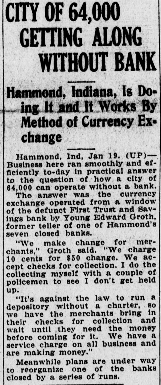 CITY OF 64, 000 GETTING ALONG WITHOUT BANK Hammond, Indiana, Is Doing It and It Works By Method of Currency Exchange Hammond, Ind, Jan 19. (UP)Business here ran smoothly and efficiently to-day in practical answer to the question of how a city of 64,000 can operate without a bank. The answer was the currency exchange operated from a window of the defunct First Trust and Savings bank by Young Edward Groth, former teller of one of Hammond's seven closed banks. "We make change for merchants," Groth said. "We charge 10 cents for $50 change. We accept checks for collection. I do the collecting myself with a couple of policemen to see I don't get held up. "It's against the law to run a depository without a charter, so we have the merchants bring in their checks for collection and wait until they need the money before coming for it. We have a service charge on all business and are making money." Meanwhile plans are under way to reorganize one of the banks closed by a series of runs.