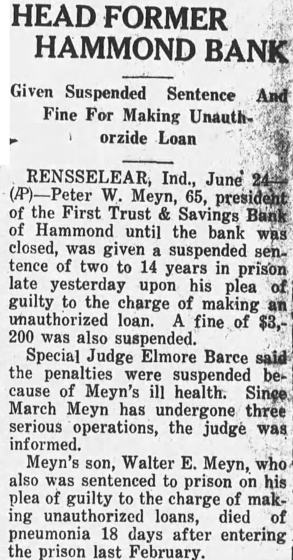 RENSSELEAR, Ind., June 24(AP). Peter W. Meyn, 65, president of the First Trust & Savings Bank of Hammond until the bank was closed, was given suspended sentence of two to 14 years in prison late yesterday upon his plea of guilty to the charge of making an unauthorized loan. A fine of $3,200 was also suspended. Special Judge Elmore Barce said the penalties were suspended because of Meyn's ill health. Since March Meyn has undergone three serious operations, the judge was informed. Meyn's son, Walter E. Meyn, who also was sentenced to prison on his plea of guilty to the charge of making unauthorized loans, died of pneumonia 18 days after entering the prison last February.