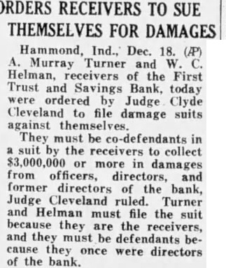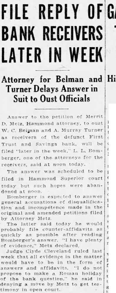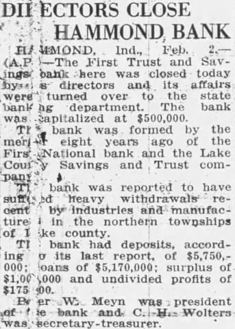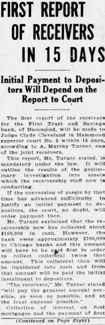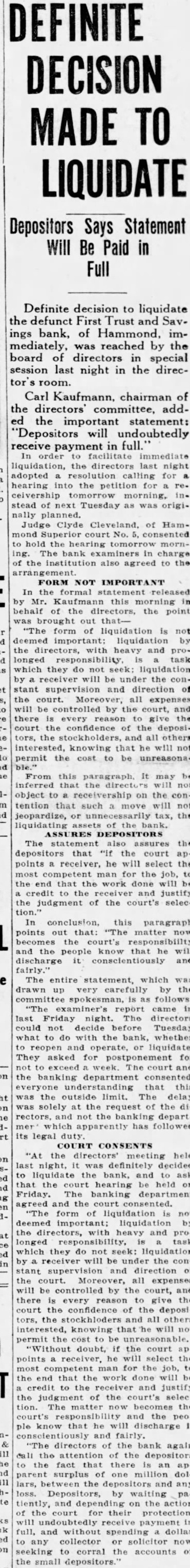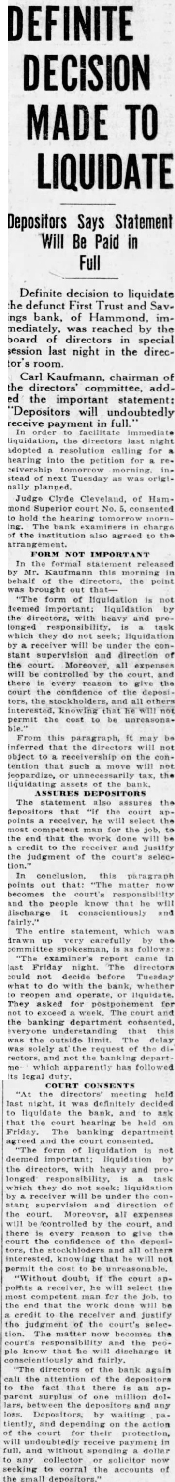Definite decision to liquidate the defunct First Trust Savings bank, of Hammond, immediately, was reached by the board of directors in special session last night in the direcroom. Carl Kaufmann, chairman of the directors' committee, added the important statement: Depositors will undoubtedly receive payment in full." order facilitate immediate liquidation, the directors night adopted resolution calling for hearing into the petition for ceivership tomorrow morning, instead of next Tuesday as was originally planned. Judge Clyde Cleveland. of Hamconsented to the ing. The bank in charge of the also agreed to the
