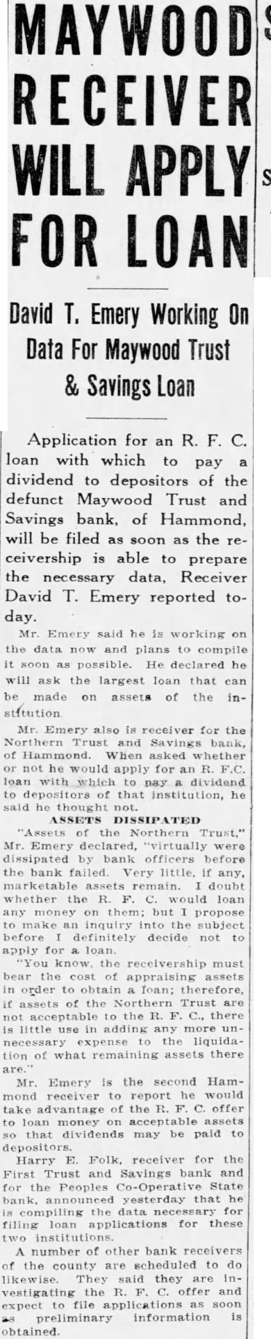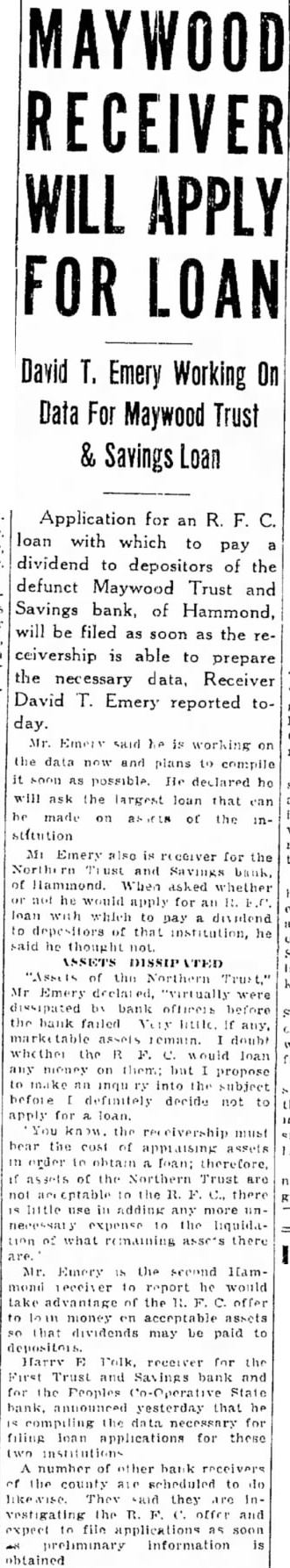 David T. Emery Working On Data For Maywood Trust & Savings Loan Application for an R. F. C. loan with which to pay dividend to depositors of the defunct Maywood Trust and Savings bank. of Hammond, will be filed as soon as the receivership is able to prepare the necessary data, Receiver David T. Emery reported today. Mr Emery the and possible. He he will ask the largest loan that can be made assets of stitution Emery for the and of Hammond. When asked not would for R. loan with institution, he said he ASSETS "Assets of the Trust," Mr. Emery declared, "virtually dissipated by before the bank whether the would loan any but propose an the subject before decide not to apply You must the appraising assets in order to obtain loan: therefore, if of the Northern Trust are the C., there little adding tion of what assets there Emery the second Hammond report would of the offer to loan money acceptable assets that dividends be paid Harry receiver for the Savings bank and for the State bank, yesterday that the data for is filing applications for these two number bank the scheduled to They said they vestigating the R. offer and expect file soon as is obtained.