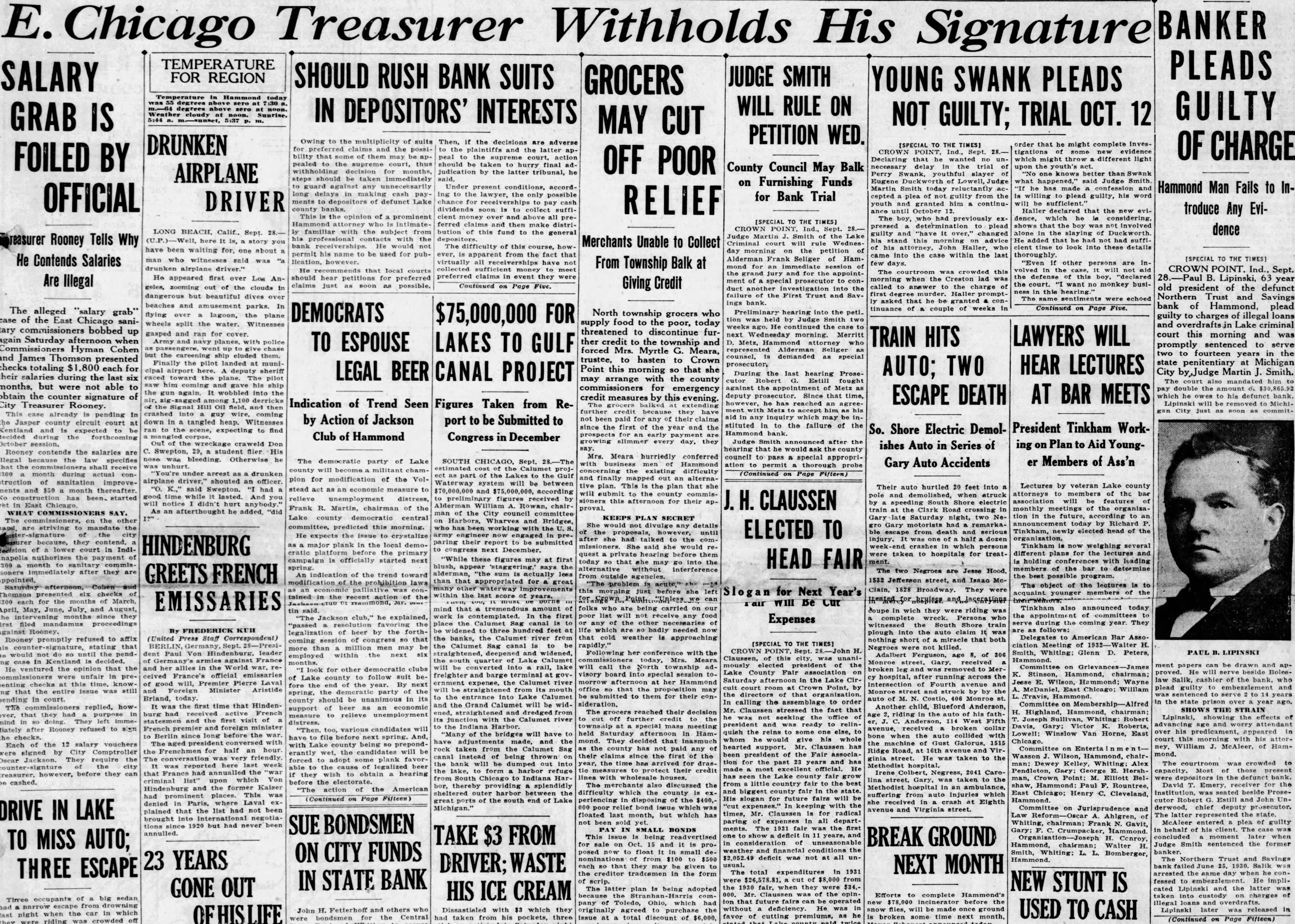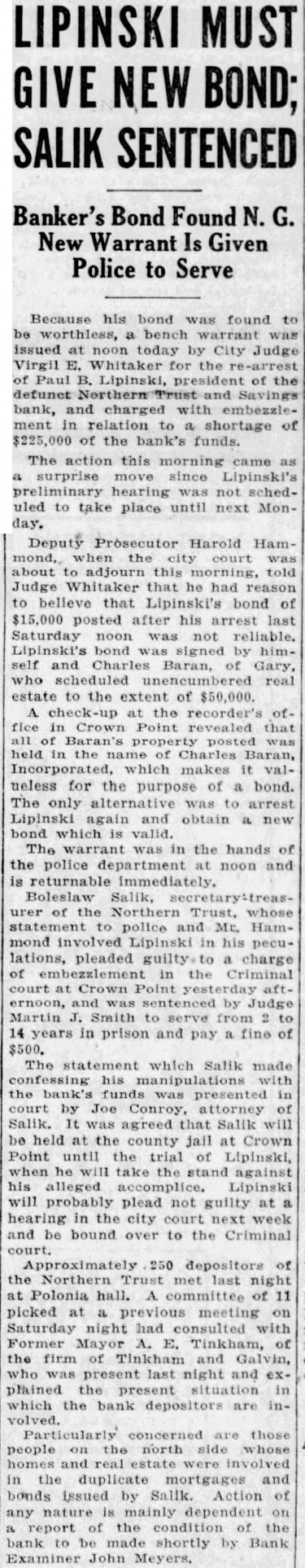 LIPINSKI MUST GIVE NEW BOND; SALIK SENTENCED Banker's Bond Found N. G. New Warrant Is Given Police to Serve Because his bond found to be worthless, bench issued noon today by City Judge Virgil E. Whitaker for the re-arrest of Paul B. Lipinski, president of the defunct Savings bank, and charged with in to of $225,000 of the bank's funds. The action this morning came surprise move since Lipinski's hearing not scheduled to take place until next Monday. Deputy Prosecutor Harold Hammond, the city court about to adjourn this told Judge Whitaker that he had reason to believe that Lipinski's bond of $15,000 after his arrest last Saturday noon reliable. Lipinski's bond by self Charles Baran, of Gary, who scheduled real estate to the extent of $50,000. check-up recorder's fice in Crown Point that Baran's held in the of Charles Baran, Incorporated, which makes it valueless for the purpose of a bond. The only alternative to arrest Lipinski again obtain which valid. The warrant in the hands of the police department noon and is returnable immediately. Boleslaw Salik, of the Trust, whose to police and Mr. Hammond Lipinski in his peculations, pleaded charge of the Criminal court at Crown Point by Judge Martin Smith to serve from to 14 years in prison and pay fine of $500. The statement which Salik made confessing his the funds presented court by Joe Salik. agreed that Salik will be held at the county jail at Crown Point until the trial of Lipinski, when take the against alleged Lipinski will probably plead not guilty at hearing the city week and be bound to the Criminal Approximately 250 depositors of the Northern Trust night at Polonia hall. of 11 picked at previous on Saturday night had consulted with Former Mayor E. Tinkham, of the firm of Tinkham and Galvin, present last night and explained the present situation which the bank depositors volved. Particularly those people north side homes and the duplicate mortgages and bonds issued by Action of any mainly dependent report of the of the bank to be shortly by Bank Examiner John Meyers.