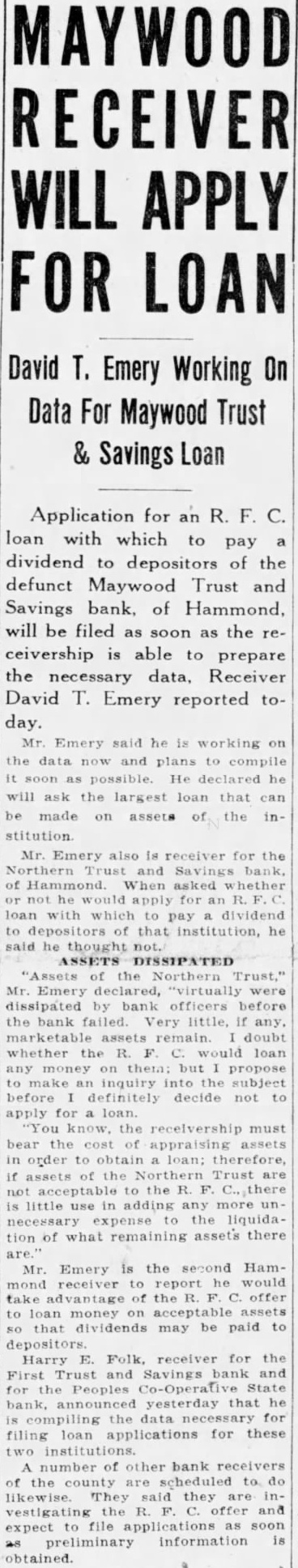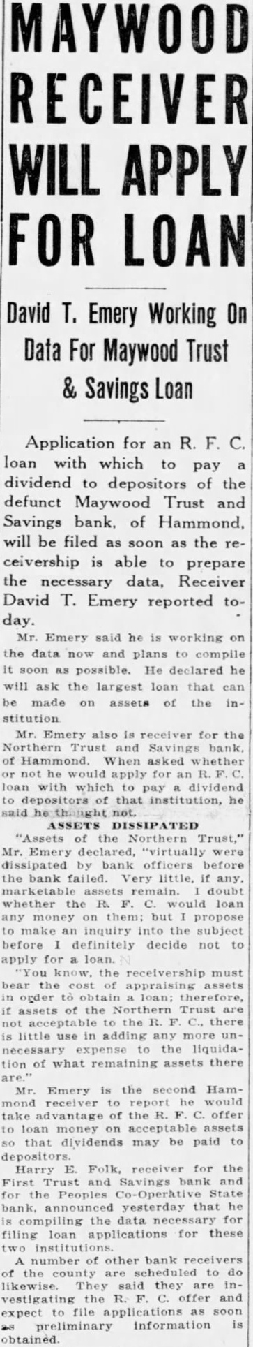 MAYWOOD RECEIVER WILL APPLY FOR LOAN David T. Emery Working On Data For Maywood Trust & Savings Loan Application for an R. F. C. loan with which to pay dividend to depositors of the defunct Maywood Trust and Savings bank, of Hammond, will be filed as soon as the receivership is able to prepare the necessary data, Receiver David T. Emery reported to- day. Emery said he is on the and plans compile He he ask the that can made on assets the inMr. Emery also is receiver for the Northern and Savings bank, of Hammond. When whether R. pay to that he said he thought ASSETS DISSIPATED Northern Mr. Emery declared, "virtually were dissipated by bank officers before the bank failed. Very doubt whether loan on but propose inquiry the subject before definitely decide not to for the must bear of assets in order obtain therefore, if assets Northern Trust not acceptable is any the liquidation of assets there are.' Mr. Emery is the second Hamwould the offer to loan money acceptable dividends may be paid to depositors Harry E. receiver for the Trust and Savings and First Peoples State bank, announced yesterday that he the for filing loan applications for these number of other bank of the scheduled likewise. they and vestigating expect to file as preliminary information is obtained.