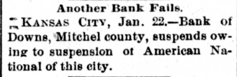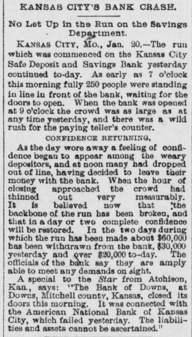 THE KANSAS CITY BANK FAILURE. IT CAUSES ANOTHER INSTITUTION TO CLOSE ITS DOORS-THE RUN ON THE SAVINGS BANK MODERATING Kansas City, Mo., Jan. 20.-Pank Examiner J. F. Marshall. with a large corps of assistants, was busy to-day examining the condition of the American National Bank, which suspended yesterday. He declined to make any statement concerning the bank's affairs, and said his report to the Controller would probably not be made for three weeks. There is some talk of the bank's resuming business. President Stimson says that if the stockholders care to repair the impatred capital of the bank. he sees nothing to prevent resumption. The stock of the bank was held principally in the East. and inasmuch as the depositors will probably be paid in full, the effect upon local business men will be slight. A dispatch to "The Star" from Atchison, Kan., says: "The Bank of Downs, at Downs, Mitchell County, closed its doors this morning. It was connected with the American National Bank of Kansas City, which failed yesterday. The liabilities and assets cannot be ascertained." The run which was begun on the Kansas City Safe Deposit and Savings Bank yesterday, continued to-day. As early as 7 o'clock this morning fully 250 people were standing in line in front of the bank waiting for the doors to open. When the bank was opened at 9 o'clock, the crowd was as large as at any time yes terday. and there was a wild rush for the paying teller's counter. As the day wore away a feeling of contidence began to appear among the weary depositors, and at noon many had dropped out of line, having decided to leave their money with the bank. When the hour of closing approached the crowd had thinned out measure ably. It is believed now that the backbone of the run has been broken. and that in a day or two complete confidence will be restored. In the two days during which the run has been made. about $60,000 has been withdrawn from the bank. The officials of the bank say they are amply able to meet demands on sight. The failure of the American National Bank was not wholly unexpected in this city. Bankers had been growing cautious in view of the extent to which the Southwestern land speculations had been carried. and their own necessities in last December prevented the far Western institutions from securing relief from seaboard. There was no new word here as to the the condition of the bank, and the city correspondents are believed to be well protected. George G. Williams, president of the Chemical National Bank, one of the correspondents, said yesterday that lie believed the depositors of the Western bank would be paid in full. From all that he had heard. he said, President Stimson was a man of integrity and the deposits had been reduced so much that there should be a successful liquidation of the affairs. He thought that Mr. Stimson's published statement was a clear exposition of the situation.