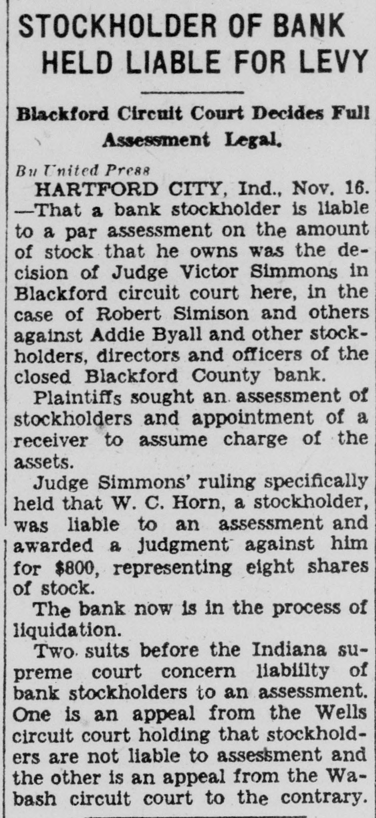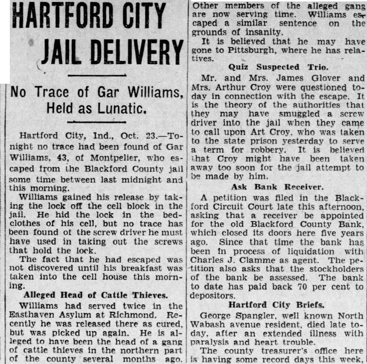 HARTFORD CITY JAIL DELIVERY No Trace of Gar Williams, Held as Lunatic. Hartford City, Ind., Oct. 23.-Tonight no trace had been found of Gar Williams, 43, of Montpelier, who escaped from the Blackford County jail some time between last midnight and this morning. Williams gained his release by taking the lock off the cell block in the jail. He hid the lock in the bedclothes of his cell, but no trace has been found of the screw driver he must have used in taking out the screws that hold the lock. The fact that he had escaped was not discovered until his breakfast was taken into the cell house this morning. Alleged Head of Cattle Thieves. Williams had served twice in the Easthaven Asylum at Richmond. Recently he was released there as cured, but was picked up again. He is alleged to have been the head of gang of cattle thieves in the northern part Other members of the alleged gang are now serving time. Williams esr caped a similar sentence on the grounds of insanity. It is believed that he may have gone to Pittsburgh, where he has relatives. Quiz Suspected Trio. Mr. and Mrs. James Glover and Mrs. Arthur Croy were questioned today in connection with the escape. It is the theory of the authorities that they may have smuggled a screw driver into the jail when they came to call upon Art Croy. who was taken to the state prison yesterday to serve term for robbery It is believed that Croy might have been taken away too soon for the jail attempt to be made by him. Ask Bank Receiver. A petition was filed in the Blackford Circuit Court late this afternoon, asking that receiver be appointed for the old Blackford County Bank, which closed its doors here five years ago. Since that time the bank has been in process of liquidation with Charles J. Clamme as agent. The petition also asks that the stockholders of the bank be assessed. The bank to date has paid back 70 per cent to depositors. Hartford City Briefs. George Spangler. well known North Wabash avenue resident. died late today. after an extended illness with paralysis and heart trouble. The county treasurer's office here