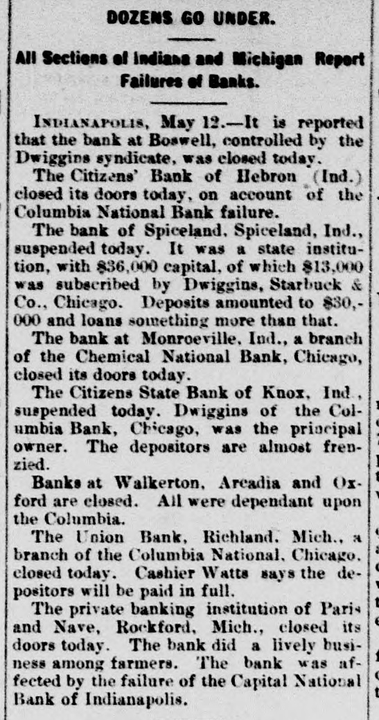 DOZENS GO UNDER. All Sections of Indiana and Michigan Report Failures of Banks. INDIANAPOLIS, May 12.-It is reported that the bank at Boswell, controlled by the Dwiggins syndicate, was closed today. The Citizens' Bank of Hebron (Ind.) closed its doors today, on account of the Columbia National Bank failure. The bank of Spiceland. Spiceland, Ind., suspended today. It was a state institution, with 836,000 capital, of which $13,000 was subscribed by Dwiggins, Starbuck & Co., Chicago. Deposits amounted to $30,000 and loans something more than that. The bank at Monroeville. Ind., a branch of the Chemical National Bank, Chicago, closed its doors today. The Citizens State Bank of Knox. Ind suspended today. Dwiggins of the Columbia Bank, Chicago, was the principal owner. The depositors are almost frenzied. Banks at Walkerton, Arcadia and Ox. ford are closed. All were dependant upon the Columbia. The Union Bank, Richland. Mich branch of the Columbia National, Chicago. closed today. Cashier Watts says the depositors will be paid in full. The private banking institution of Paris and Nave, Rockford, Mich., closed its doors today. The bank did a lively business among farmers. The bank was affected by the failure of the Capital National Bank of Indianapolis.