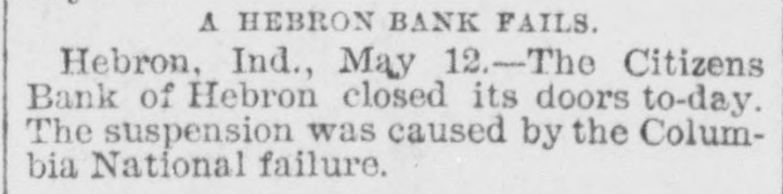 The Citizens' bank of Hebron ... was examined by a committee of Hebron citizens, who went over the books and pronounced it all right. The bank will reopen for business the first of the week. (Indiana State Sentinel, May 17, 1893).