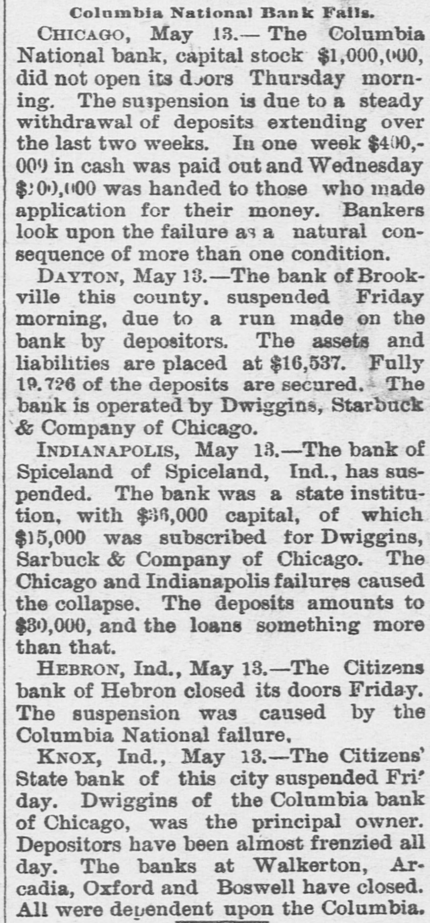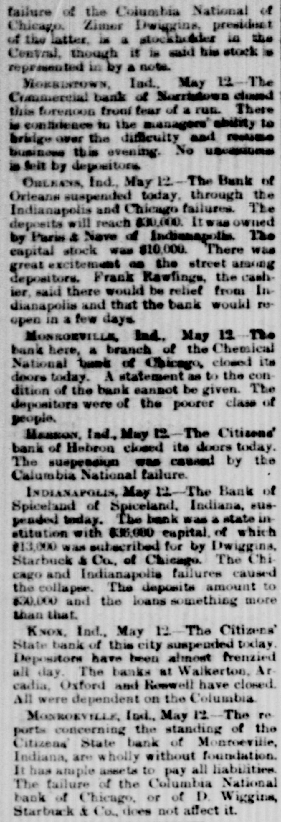 failure of the Columbia National of Chicago. Zimer Dwiggins, president of the latter. in a stockbobles in the Central though it is said his stock . represented in by a note. YORRINTOWN, Ind. May 12 The Commercial bank of Norridown classa this forenoon front tear of a run. There to confidence to the managers ability to bridge over the difficulty and results business this evening. No is felt by depositors ORLEANS, Ind. May 12. The Bank of Orleans suspended today. through the Indianapolis and Chicago failures. The deposits will reach $30,000. It was owned by Paris & Nave of Indianapolis. The capital stock was $10,000. There was great excitement as the street aroung depositors. Frank Rawlings, the cash ier, said there would be rehel from In dianapolis and that the bank would no open in a few days MONROEVILLA Ind. May 12 no bank here, a branch of the Chemical National thank of Chicago, closed its doors today. A statement as to the con dition of the bank eannot be given. The depositors were of the poorer class of people. MERRAN, lad. May 12-The Citizens' bank of Hebron closed its doors today. The suspendium was caused by the Calumbia National failure. INDIANAPOLIS, May -The Bank of Spiceland of Spiceland, Indiana. suspended today. The bank was . state in stitution with 636,000 capital. of which $13,000 was subscribed for by Dwiggins, Starbuck 4 Co. of Chicago. The Chi cago and Indianapolis failures caused the collapse. The deposite amount to $30.000 and the loans something more than that. KNOX, Ind., May 12 The Citizens' State bank of this city suspended today. Depositors have been almost frenzied all day. The banks at Walkerton, Ar. cadia, Oxford and Rewwell have closed. All were dependent on the Columbia MOSROEVILLE, Ind., May 12 The re ports concerning the standing of the Citizens State bank of Montoeville, Indiana, are wholly without foundation. It has atapie assets to pay all liabilities. The failure of the Columbia National bank of Chicago, or of D. Wiggins, Starbuck & Co., does not affect it.