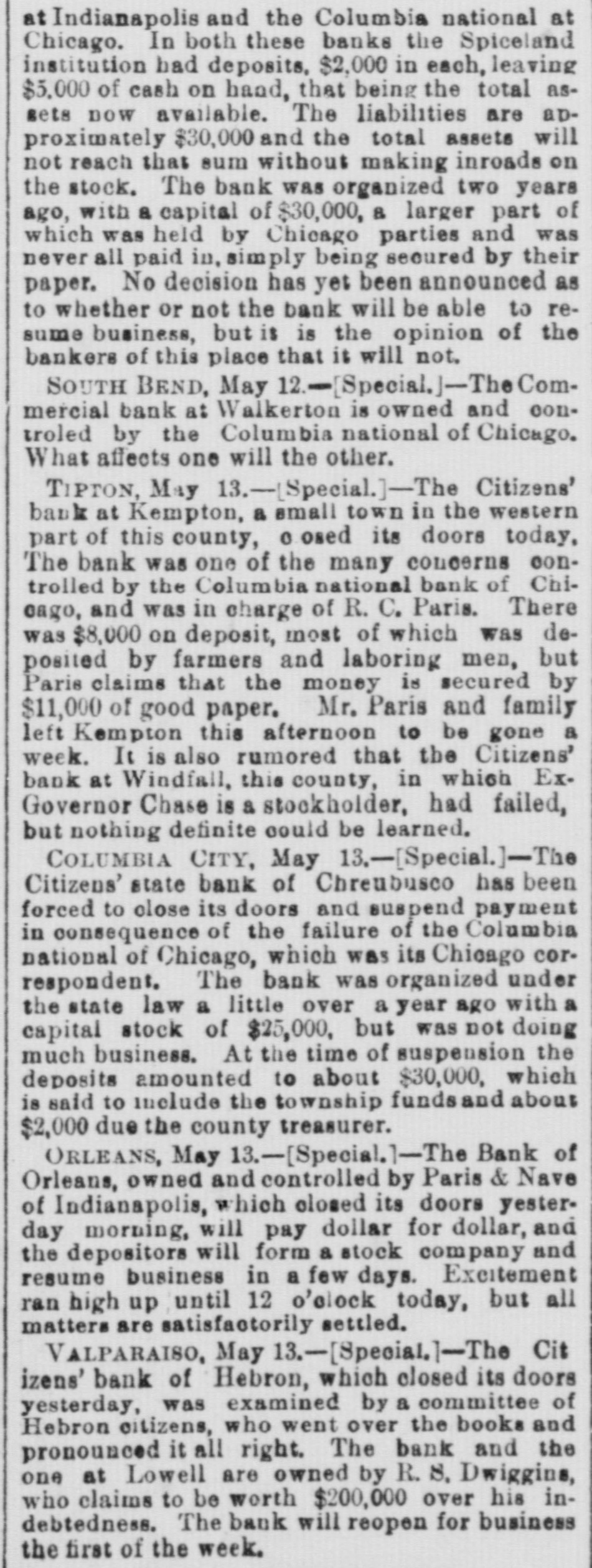 at Indianapolis and the Columbia national at Chicago. In both these banks the Spiceland institution had deposits, $2,000 in each, leaving $5,000 of cash on hand, that being the total asgets now available. The liabilities are anproximately $30,000 and the total assets will not reach that sum without making inroads on the stock. The bank was organized two years ago, with a capital of $30,000, a larger part of which was held by Chicago parties and was never all paid in, simply being secured by their paper. No decision has yet been announced as to whether or not the bank will be able to resume business, but is is the opinion of the bankers of this place that it will not. SOUTH BEND, May 12.-[Special.]-TheCommercial bank at Walkerton is owned and controled by the Columbia national of Chicago. What affects one will the other. TIPTON, May 13.--(Special.]-The Citizens' bank at Kempton, a small town in the western part of this county, 0 osed its doors today. The bank was one of the many concerns controlled by the Columbia national bank of Chicago, and was in charge of R. C. Paris. There was $8,000 on deposit, most of which was deposited by farmers and laboring men, but Paris claims that the money is secured by $11,000 of good paper. Mr. Paris and family left Kempton this afternoon to be gone a week. It is also rumored that the Citizens' bank at Windfall, this county, in which ExGovernor Chase is a stockholder, had failed, but nothing definite could be learned. COLUMBIA CITY, May 3.-[Special.]-The Citizens' state bank of Chreubusco has been forced to close its doors and suspend payment in consequence of the failure of the Columbia national of Chicago, which was its Chicago correspondent. The bank was organized under the state law a little over a year ago with a capital stock of $25,000. but was not doing much business. At the time of suspension the deposits amounted to about $30,000, which is said to include the township fundsand about $2,000 due the county treasurer. ORLEANS, May 1.3.-[Special.]-The Bank of Orleans, owned and controlled by Paris & Nave of Indianapolis, which closed its doors yesterday morning, will pay dollar for dollar, and the depositors will form a stock company and resume business in a few days. Excitement ran high up until 12 o'clock today, but all matters are satisfactorily settled. VALPARAISO, May 13.-[Special.]-The Cit izens' bank of Hebron, which closed its doors yesterday, was examined by a committee of Hebron citizens, who went over the books and pronounced it all right. The bank and the one at Lowell are owned by R. S. Dwiggins, who claims to be worth $200,000 over his indebtedness. The bank will reopen for business the first of the week.