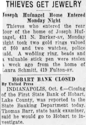 THIEVES GET JEWELRY Joseph Hufnagel Home Entered Monday Night Thieves who entered the rear door of the home of Joseph Hufnagel, 411 N. Barker-av, Monday night took two gold rings valued at $60 watches, police said. wedding ring. beads and valuable stick pen were stolen week ago from the home of Laura Schmitt, 419 Fulton-av. BANK CLOSED By Oct. -Closing of the First State Bank of Hobart, Lake County, was reported to the State Banking Department today. Thomas Barr, state examiner, said he would go to Hobart to investigate.