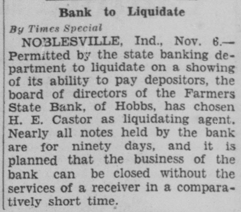 Bank to Liquidate By Times Special NOBLESVILLE, Ind., Nov. 6.Permitted by the state banking department to liquidate on a showing of its ability to pay depositors, the board of directors of the Farmers State Bank, of Hobbs, has chosen H. E. Castor as liquidating agent. Nearly all notes held by the bank are for ninety days, and it is planned that the business of the bank can be closed without the services of a receiver in a comparatively short time.