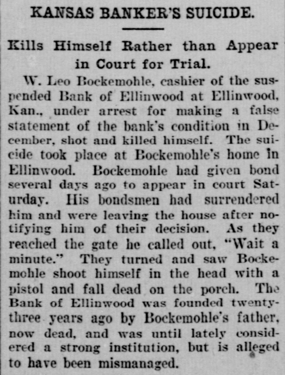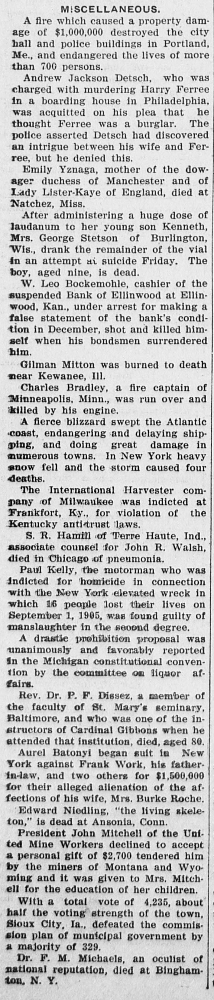NEWS SUMMARY Seven people, one an American, were killed as the result of a train wreck near Rome, Italy. Fire at Deer River Minn., destroyed a block and a half of the business portion of the town, causing a loss of $100,000. John Sharp Williams has been chosen senator from Mississippi, to succeed D. N. Money, whose term ex. pires March 4, 1911. The navy department has decided to send the gunboat Paducah, now at New Orleans, to Haytien waters during the revolutionary troubles. The senate committee on military affairs has agreed upon a favorable report on Senator Warren's bill in. creasing the pay of the army. At the annual meeting of the Aetna Indemnity company at Hartford, Conn. last week. the Heinze interests were voted out of the directorship. A motion offered in the Kansas house of representatives declaring William H. Taft the choice of Kansas for president was unanimously carried. Four firemen were killed and fifteen Injured, including Chief George Hor ton. by the falling of the wall of a burning building in Baltimore. Rev. John F. Kaestering, aged 78, a retired Lutheran elergyman, was murdered in Cheltenham, a suburb of St. Louis, robbery being the motive. Commissioner Ballinger of the general land office has asked congress for a special appropriation of $50,000 for surveying homestead entries with in forest reservations. Frank J. Constantine. who killed Mrs. Louise Gentry in Chicago and at tempted suicide later by throwing him self from a gallery of the prison, is dead from his injuries. Former United States Senator Geo. Peabody Wetmore was elected to the United States senate on the first ballot cast in both branches of the general assembly of Rhode Island. Leslie M. Shaw has resigned the presidency of the Carnegie Trust company, which he assumed early last March on his retirement from the treasury portfolio at Washington. President W. L. Bochemohle of the suspended Bank of Ellinwood of Ellinwood. Kan., has been arrested. charged with having sworn falsely in a report of the bank's condition last month. The Labor party held a conference at Hull, England, on January 21, at which an amendment to the constitution binding the party to Socialism was rejected by a large majority. The prefect of St. Petersburg has suspended the Tovarish and the Seved nia, two newspapers of wide circulation, on the ground that they were following a subversive course and preached revolution. Governor Patterson of Tennessee has commuted the death sentence of Lee Holder, aged 19, to life imprison ment. Holder, a year ago, murdered his father, B. G. Holder, a preacher of Cumberland Presbyterian church. David S. Kresky and William A. McGowan, who pleaded guilty to obtaining rebates in violation of the United States laws last December. were fined $1,000 each by Judge Smith McPherson in the federal court at Kansas City. Clarence Darrow, of Chicago, who was operated on at a Los Angeles hospital for mastoiditis, is improving. The physicians in attendance regarded his condition as favorable and believe that the operation ultimately will prove a complete success. The state census of Rhode Island, completed and presented to the general assembly last week, shows an increase in population of 12 per cent since 1903. The present population of the state is 480,080, while five years ago it was 428,556. A bulletin just issued by the interstate commerce commission, covering the months of July, August and September, 1907, shows that the number of casualties on railroads during that quarterly period were 23,063, including, 1,339 killed and 21,724 injured. The return to Italy of emigrants from the United States is gradually stopping, while emigration to that country is being resumed. Steamers leaving Genoa and Naples before the end of the month will take back to America at least 5,000 emigrants. Nils Nielson, night tender at the lighthouse on the New Haven break water. committed suicide by cutting his throat. He had a reputation as a hero, having saved a number of lives. It is thought that the lonely life in the lighthouse unbalanced his mind. Charles As Roberto, describing himself as president of the Italian Exchange bank, located in the Italian quarter of Baltimore, says on Dec. 26. while in the office of the bank late at night, three masked men entered. forced him to open the safe and took $8,000. The Illinois Central Railroad company has entered suit against the town of Herrin, Ills., for $700,000, on the grounds of interfering with traffic. A Herrin police magistrate recently assessed a fine against the railroad for shipping into the place beer and whisky. Representative Kahn of California has introduced a bill to provide for the