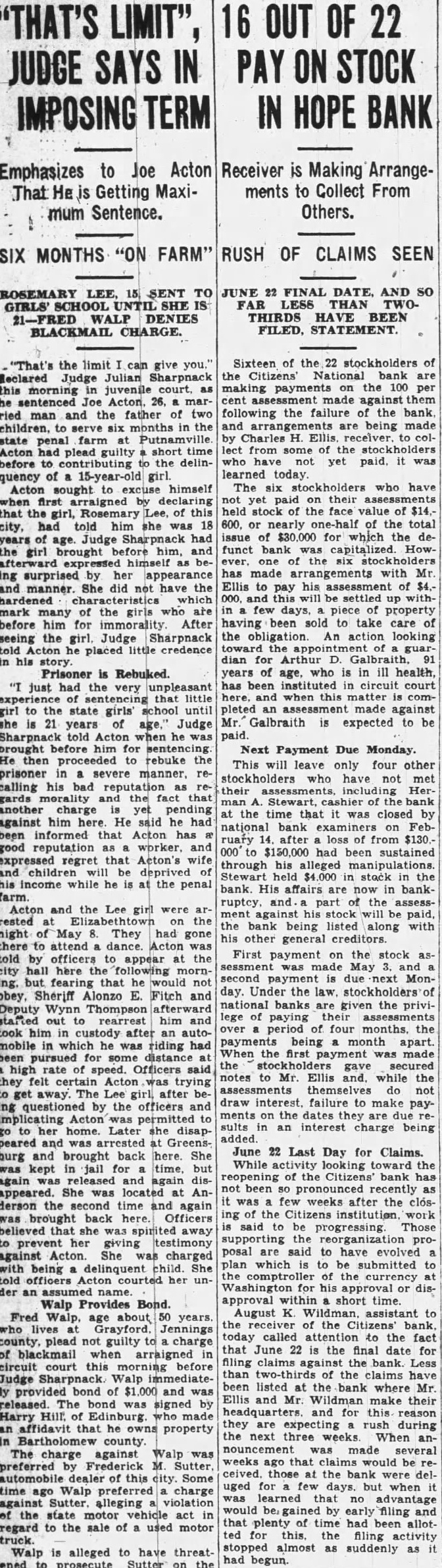 OUT OF ON STOCK IN HOPE BANK Receiver is Making Arrangements to Collect From Others. RUSH OF CLAIMS SEEN JUNE FINAL DATE, so LESS THAN TWOTHIRDS HAVE BEEN FILED, STATEMENT. Sixteen of the stockholders National bank payments 100 per made against them the failure the being made Charles from some yet paid, learned The six stockholders who have paid their held stock of the face value of 600. or nearly of the total issue $30,000 for which the funct bank Howmade arrangements with Mr. Ellis to pay his assessment of and settled few days, piece of property having been sold to take care of obligation. An action looking toward dian for Arthur years of age, who is in ill been instituted circuit court here. when matter pleted an assessment made against Galbraith expected to be paid. Next Payment Monday. This will leave only four other stockholders who have not met their Stewart, the time that closed by national bank examiners on ruary after of $130.had sustained through his alleged stack the bank. His affairs in bankpart the ment stock be paid, the bank being listed along other general creditors. First payment the stock second Monday. Under the law. banks given the privilege paying period of four months. the being month apart. When the made the notes to Ellis while the themselves do not draw failure to payments the dates sults in an interest charge being added. June 22 Last Day for Claims. While looking toward the reopening the Citizens' bank has been pronounced recently was after the clósof the Citizens institution. said be progressing. Those supporting the proposal to have evolved plan which be submitted the comptroller of the Washington for approval within short time. August the the today called attention to the fact that June 22 the date for filing claims the bank. than the claims been listed the where Mr. Ellis and Mr. Wildman make their for this reason rush during the next three weeks. When nouncement made several that would those the bank deluged days. but when learned that would by filing and that plenty time had been allotthe filing activity stopped almost as suddenly had begun.