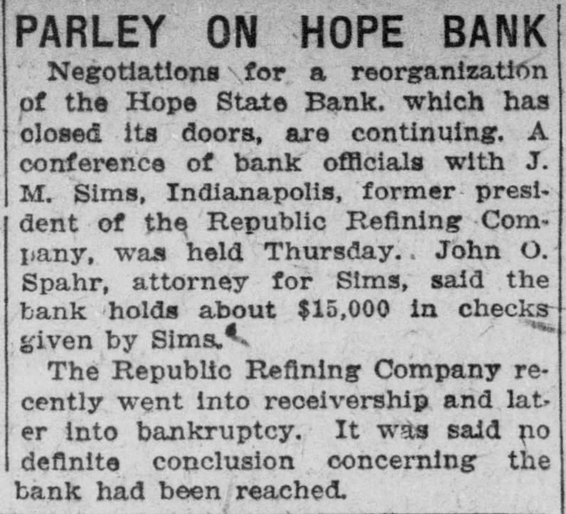 # PARLEY ON HOPE BANK Negotiations for a reorganization of the Hope State Bank. which has closed its doors, are continuing. A conference of bank officials with J. M. Sims, Indianapolis, former president of the Republic Refining Company, was held Thursday. John O. Spahr, attorney for Sims, said the bank holds about $15,000 in checks given by Sims. The Republic Refining Company recently went into receivership and later into bankruptcy. It was said no definite conclusion concerning the bank had been reached.