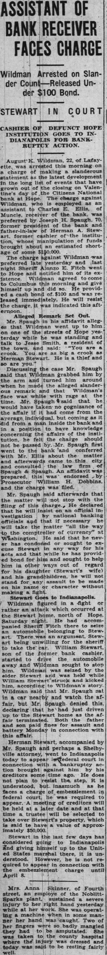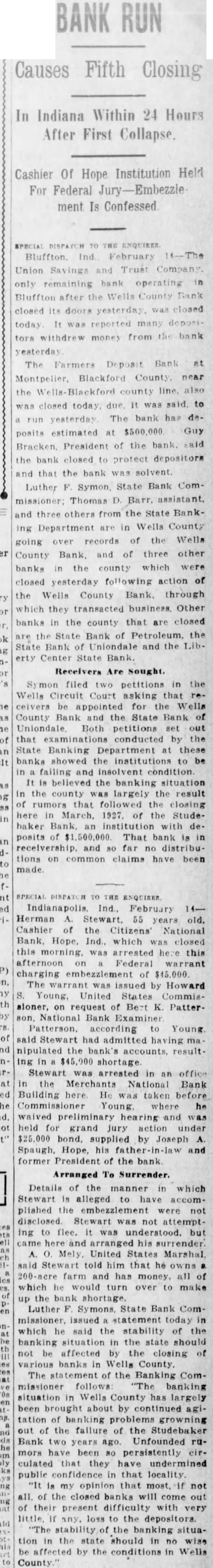 BANK Causes Fifth Closing In Indiana Within 24 Hours After First Collapse. Cashier Of Hope Institution Held For Federal ment Is Confessed ENQUIRER February Savings Trust operating closed was closed money bank Bank Montpeller, near the closed due, said. to yesterday The has deposits estimated Guy Bracken. President of the the bank closed protect depositors and the solvent. Luther Symon State Bank ComState Banking Department are in Wells County records Wells going County Bank, of three other banks the county closed action of Wells County Bank. through business Other banks the county that are closed State Bank Petroleum. the Bank the Center State Bank. Are Sought. the Court ceivers appointed for the Wells County and of Uniondale Both petitions set out that Banking Department these banks institutions failing and insolvent condition. the banking situation the county largely the result the closing of the Studebaker deposits That and far Ind., Herman old. Cashier of Ind., which closed this was arrested this afternoon Federal charging issued by Howard United States Commissioner, request Bert Patterson, National Bank according Young had admitted resulting shortage Bank Building was before he preliminary and held by Joseph Spaugh, Hope, his and former President of the Arranged Surrender. Details which alleged plished embezzlement not disclosed. not was understood. but United said Stewart him that has money. which to make Luther State Bank Comstatement which the stability the the should not the closing of banks the Banking banking has been agithe failure the Bank two Unfounded rupersistently culated undermined that my that not closed banks come out difficulty with the by the in