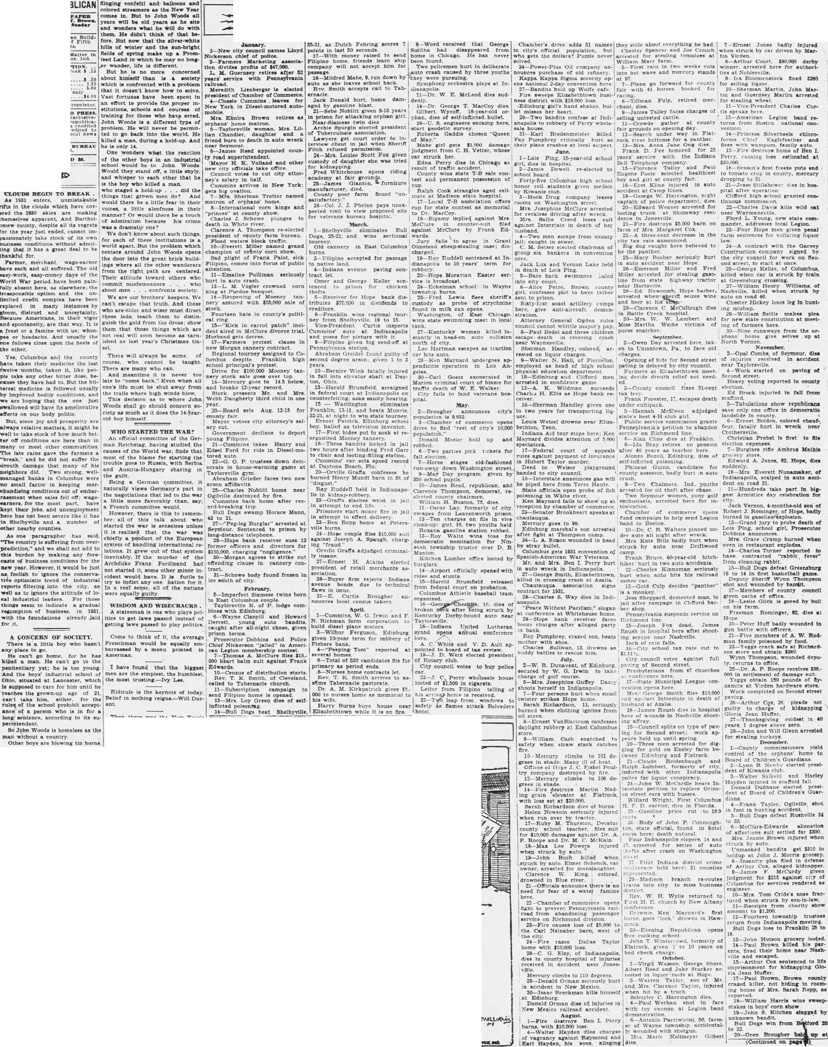 CLOUDS BEGIN TO BREAK 1931 enters, rifts in the clouds which have ered the 1930 skies are making themselves apparent. And Bartholcounty, despite all its regrets the year just ended, cannot impassionately take stock of its own business without admitting that has great deal to thankful for merchant. wage-earner each and all The old days of the World War period have been painfully absent here. the irresponsible optism the limited credit complex have been replaced in many instances by gloom, distrust uncertainty. Because Americans, in their vigor and spontaneity, are that way. feast famine with us; whooheadache. And usually the follows close upon the heels of the other. Yes, Columbus and the county have taken their medicine the last twelve months, taken like ple take any other bitter dose, cause they have had to. But the bitterest medicine followed usually by improved bodily conditions, and are hoping that the one just swallowed will have its ameliorative effects our body politic. But, since joy and prosperity always relative matters, might be well take stock of how much betoff conditions here than many most other communities. The late rains gave the farmers and he did suffer the drouth damage that many of his neighbors did. Two strong, wellmanaged banks in Columbus no small factor in keeping merchandising conditions out of embarrassment when sales off; wageearners, for the most part, have kept their jobs, and unemployment here has not been severe like has Shelbyville and number of other nearby counties. As one paragrapher has said, country suffering from and shall not add this burden by making any forecasts of business conditions for the year. However, it would be just foolish ignore the conservaoptimistic trend of industrial reports filtering into the city, well to ignore the attitude of leaders. For those things seem indicate gradual requmption business. in 1931, with foundations already laid CONCERN OF SOCIETY. There little boy who hasn't place to He can't for he has killed man. He can't the penitentiary yet; he too young And the school Ohio, situated at Lancaster, which supposed to for him until he reaches the grown-up age of 21, can't take either. for the rules, the school prohibit acceptance person who is in for long sentence, according to its perintendent. So John Woods homeless the man without country. Other boys are blowing tin horns confetti and balloons colored the New Year comes But John Woods years will be old years he sits Sunday and what he will do with them. He didn't think of that beBuildfore. But now that the silver-white hills of winter and the sun-bright fields of spring make up PromMatter Land which he may no wander, life different. But he more concerned about himself than society which confronted problem that doesn't know how to solve. Vast fortunes have been spent effort to provide the proper inProprietor. stitutions, schools and courses training for those who have erred. John Woods different type problem. will never permitted to go back into the world. He killed during And only One wonders what the reaction the other boys in an industrial school would John Woods Would they stand off, little shyly, and whisper to each other that he the boy who killed man. who staged hold-up did the things that grown men would there be little fear in their voices, little aloofness in their manner? Or would there touch admiration because his crime dramatic We don't know about such things, for each of institutions world the problem which centers around John Woods opens the door into the great brick buildings where all other wanderers from right path centered. Their attitude toward others who commit misdemeanors shoot men confronts society. are our brothers' keepers. We escape that truth. And those and wiser must direct these lads, teach them to distinguish the gold from the dross: show them that those things which are not real will soon become as ished last year's Christmas sel. There will always be some of course, who cannot be taught. There many who And meantime never too late "come Even when all one's life must be shut away from trails where high winds This decision where John Woods shall go should concern ciety much does the old boy himself. January. city names Lloyd Nickerson chief police. association divides profits of M. after 52 service with Pennsylvania railroad. Meredith Lienberger elected president Chamber of Commerce. Cummins for New York in Diesel-motored automobile. Mrs. Elmira Brown retires orphans' home woman, Mrs. Lillian Chandler, daughter and friend burn death in auto wreck Seymour Reed appointed counroad superintendent. Mayor Volland and other city officials office. Council votes to cut city attorsalary in half. Cummins arrives in New York: ovation. Sherman Trotter named matron of orphans home. corn kings and "princes" county show. Charles Schowe plunges to death White Clarence Thompson re-elected president of county farm bureau. Flood traffic. Miller named grand champion county corn Sad plight of Frank Palot, sick Filipino, comes into focus of public Pulliman seriously Vogler crowned corn Mooney tannery assured with $55,000 sale of Fourteen hats in county's politiring in carrot patch" incident aired in McClure divorce trial, Husband decree. protest clause Morgan cannery contract. Regional tourney assigned to Columbus despite Franklin high school principal's protest. Drive for Mooney tanstock sale goes goes below, and breaks record. Stork presents Webb Daugherty third child in one year. sets Aug. for county Mayor vetoes city attorney's cut. WHO STARTED THE WAR: Government declines to deport An official committee of the Ger- young Filipino. man Reichstag. having studied the takes Henry and Edsel Ford for ride in Diesel-mocauses of the World war, finds that tored auto. most the blame for starting the 22-G. trustees down demtrouble goes Russia, with Serbia ocrats game at and sharing in Taylorsville gym. the guilt. Abraham faces two new Being German committee, affidavits 
