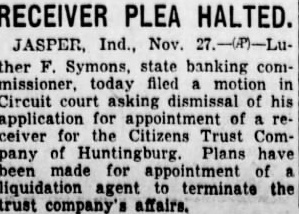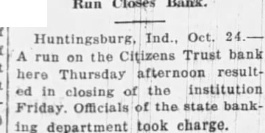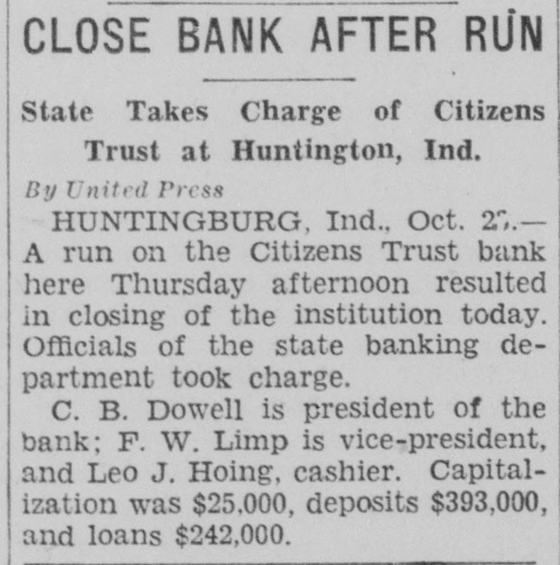 CLOSE BANK AFTER RUN State Takes Charge of Citizens Trust at Huntington, Ind. By United Press HUNTINGBURG, Ind., Oct. 27.A run on the Citizens Trust bank here Thursday afternoon resulted in closing of the institution today. Officials of the state banking department took charge. C. B. Dowell is president of the bank; F. W. Limp is vice-president, and Leo J. Hoing, cashier. Capitalization was $25,000, deposits $393,000, and loans $242,000.