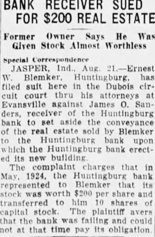 BANK RECEIVER SUED FOR $200 REAL ESTATE Former Owner Says He Was Given Stock Almost Worthless Special JASPER, Ind. Aug. Ernest filed suit here in the Dubois circuit court thru his attorneys at Evansville against James O. Sanders, receiver of the Huntingburg bank to set aside the conveyance of the real estate sold by Blemker to the Huntingburg bank upon which the Huntingburg bank erected its new building The complaint charges that in May. 1924. the Huntingburg bank represented Blemker that its stock $200 per share and transferred to him 10 shares of capital stock The plaintiff avers that the bank was failing and could not at that time pay its