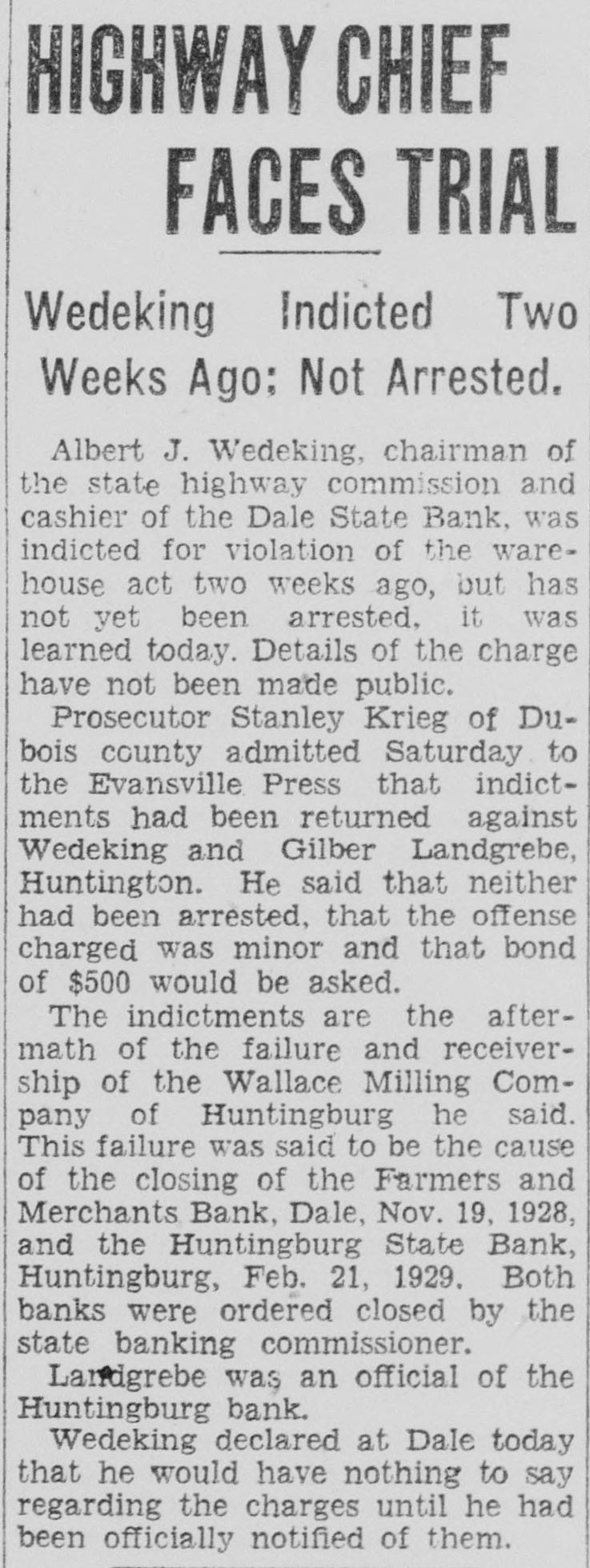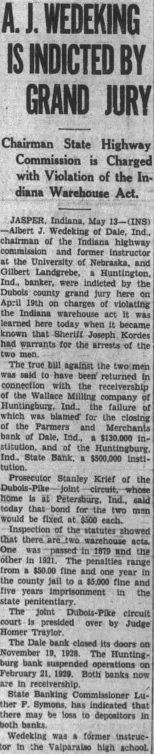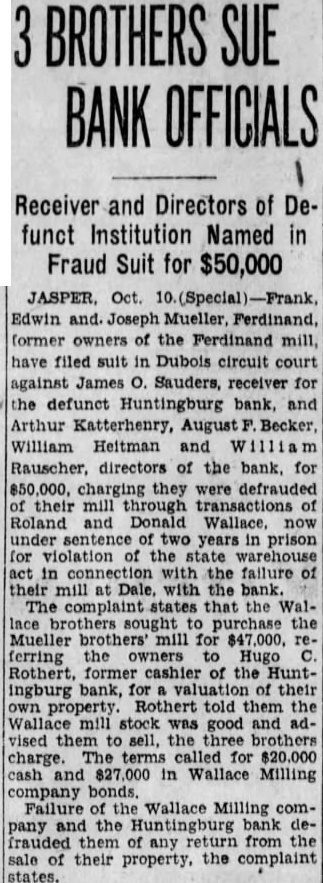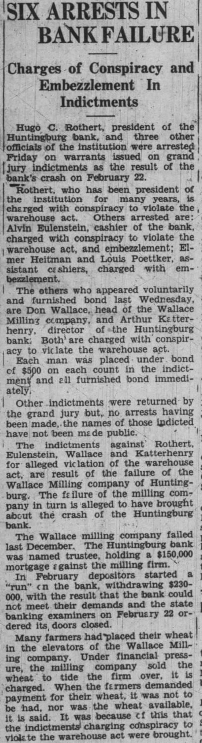 The indictments against Rothert, for alleged the warehouse act, are the outgrowth of the failure of Wallace Milling comof Huntingburg. The failure the milling company turn caused the crash of the Huntingburg Wallace Milling company failed bank named holding $150,000 mortgage against the milling firm. BANKS DOORS CLOSED In February depositors started the result that the not their and the state February 22, ordered its doors closed. Many had placed their wheat the the Wallace Milling company. Under financial pressure, the milling company the wheat tide the firm over, charged. When dewheat, not had, was the wheat said. was because this that the charging conspiracy violate the warehouse act were brought.