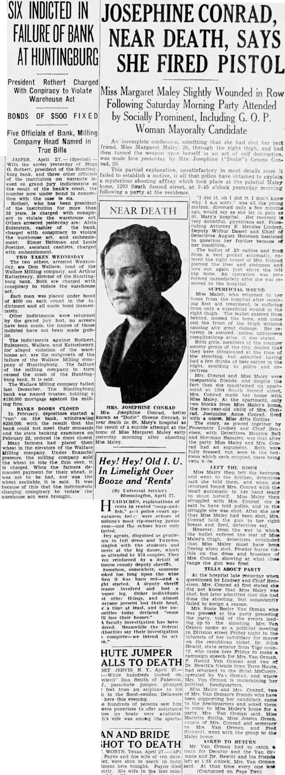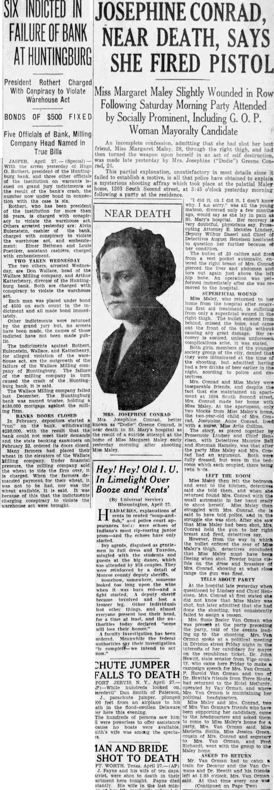 An incomplete admitting that she had shot her best friend, Miss Margaret Maley, 28, through the right thigh, and had then turned the weapon herself in of destruction, was made late yesterday by Mrs. Josephine ("Dodie") Greene Conrad, This partial explanation, unsatisfactory in most details since failed to establish motive, all that police have obtained to explain mysterious shooting affray which took place the palatial Maley home, 1203 South Second street, at o'clock yesterday morning following a party at the residence. did it, don't know all the matron, only few months NEAR DEATH would say Mary's hospital. Her recovery very doubtful, say, Prosecuting Attorney Menzies Lindsey, Deputy Wilbur Dassel and Chief hesitated question further because bullet calibre and fired pocket tered the right breast Mrs. Conrad pierced the and abdomen tore out again above the left hip performed she was moved to the hospital WOUND Miss who returned her to from the hospital after receivfirst aid from superficial wound in thigh. The bullet entered missed the front the causing any damage. Her recovery arise. was stated. Both girls, members the younger society group the city. denied that they the time the shooting. but earlier night, acording to police and deMrs. Conrad and Miss Maley were inseparable friends, despite fact that she maintained an apartSouth street, Mrs. Conrad made her home Maley. only blocks Miss Maley's MRS. JOSEPHINE CONRAD the child of Mrs. Josephine Josephine Anne Conrad. lived "Dodie" Greene Conrad, nurse, Miss Arlie Collins. near death St. Mary's hospital The story, pieced together by the suicide the Prosecutor Chief home of Miss Margaret Maley early with Detectives Maurice Bell yesterday morning after shooting and Hamsley, that Maley. the party Miss Maley and Mrs. Conhad an argument. Both fully dressed. but were which each ocupied, there being Hey! Hey! Old twin