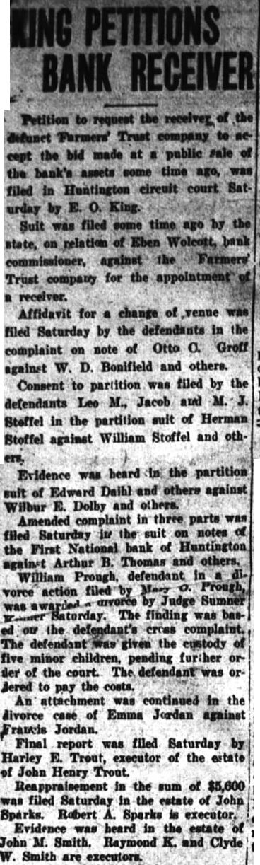 KING PETITIONS BANK RECEIVER Petition to request the of the defunct Farmers' Trust to bid made at public sale of cept the the bank's assets some time ago, was in Huntington circuit court Satfiled urday by E. O. King Suit filed time ago by the was some on relation of Eben Wolcott, bank state, commissioner, against Farmers' Trust company for the appointment a receiver. Affidavit for a change of venue was filed Saturday by the defendants in the complaint on note of Otto C. Groff against W. D. Bonifield and others. Consent to partition was filed by the defendants Leo M., Jacob and M. Steffel in the partition suit of Herman Stoffel against William Stoffel and oth Evidence was heard in the partition suit of Edward Daibl and others against Wilbur E. Dolby and others. Amended complaint in three parts was filed Saturday in the suit on notes of the First National bank of Huntington against Arthur B. Thomas and others. William Prough, defendant in Prough, action filed Mary vorce by Judge was Saturday. The finding was based OFF the defendant's cross complaint. The defendant was given the custody of five minor children, pending further order of the court. The defendant w orAered to pay the costs. An attachment was continued in the divorce case of Emma Jordan against Francis Jordan. Final report was filed Saturday by Harley E. Trout, executor of the estate of John Henry Trout. Reappraisement in the sum of $5,600 was filed Saturday in the estate of John Sparks. Robert A. Sparks is executor. Evidence was heard in the estate of John M. Smith. Raymond K. and Clyde W. Smith are executors.