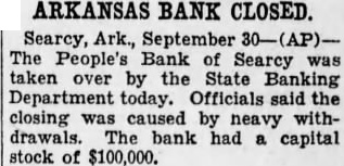 ARKANSAS BANK CLOSED. Searcy, Ark., September The People's Bank of Searcy by the State Banking Department today. Officials said the closing caused by neavy withdrawals. The bank had a capital stock $100,000.
