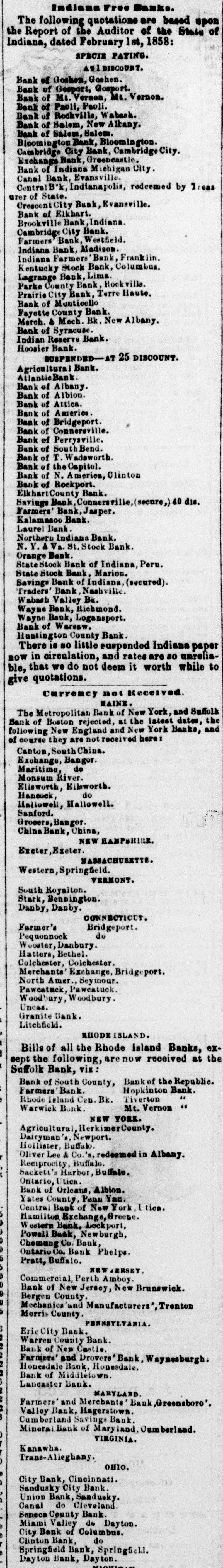 Indiana Free Hanks. The following quotations are based upon the Report of the Auditor of the State of Indiana, dated February 1st, 1858: SPECIE PATING. AT! DISCOUNT. Bank of Goshen, Goshen. Bank of Gosport, Gosport. Bank of Mt. Vernon, Mt. Vernon. Bank of Paoli, Paoli. Bank of Rockville, Wabash. Bank of Salem, New Altany. Bank of Salem, Salem. Bioomington Bank, Bloomington. Cambridge City Bank, Cambridge City. Exchange Bank, Greeneastle. Bank of Indiana Michigan City. Canal Bank, Evansville. Central B'k, Indianapolis, redeemed by Treasurer of State. Creacent City Bank, Evansville. Bank of Elkhart. Brookville Bank, Indiana. Cambridge City Bank. Farmers' Bank, Westfield. Indiana Bank, Madison. Indiana Farmers' Bank, Franklin. Kentucky Stock Bank, Columbus. Lagrange Bank, Lima. Parke County Bank, Rockville. Prairie City Bank, Terre Haute. Bank of Monticello Fayette County Bank. Merch. & Mech. Bk. New Albany. Bank of Syracuse. Indian Reserve Bank. Hoosier Bank. SUSPENDED-AT 25 DISCOUNT. Agricultural Bank. Atlantic,Bank. Bank of Albany. Bank of Albion. Bank of Attica. Bank of America. Bank of Bridgeport. Bank of Connersville. Bank of Perrysville. Bank of SouthBend. Bank of T. Wadsworth. Bank of the Capitol. Bank of N. America, Clinton Bank of Rockport. Elkhart County Bank. Savings Bank, Connersville, (secure,) 40 dis. Farmers' Bank, Jasper. Kalamasoo Bank. Laurel Bank. Northern Indiana Bank. N. Y. s Va. St. Stock Bank. Orange Bank. State Stock Bank of Indiana, Peru. State Stock Bank. Marion. Savings Bank of Indiana, (secured). Traders' Bank, Nashville. Wabash Valley Bk. Wayne Bank, Richmond. Wayne Bank, Logansport. Bank of Warsaw. Huntington County Bank. There is so little euspended Indiana paper now in circulation, and rates are 80 unreliable, that we do not deem it worth while to give quotations.