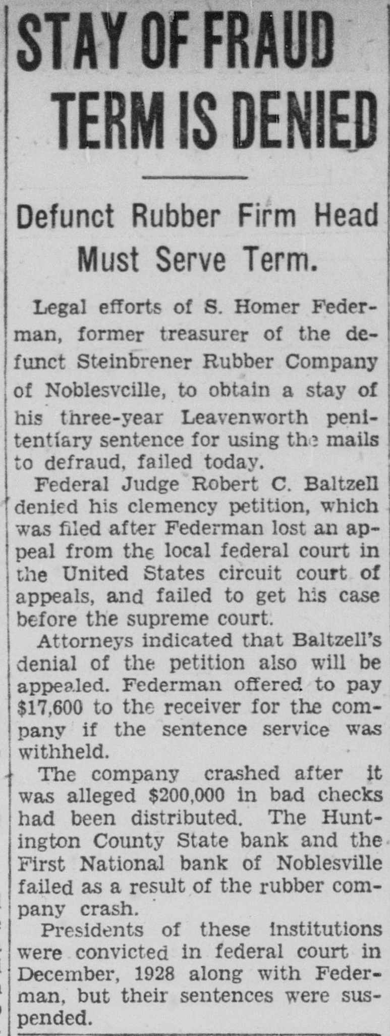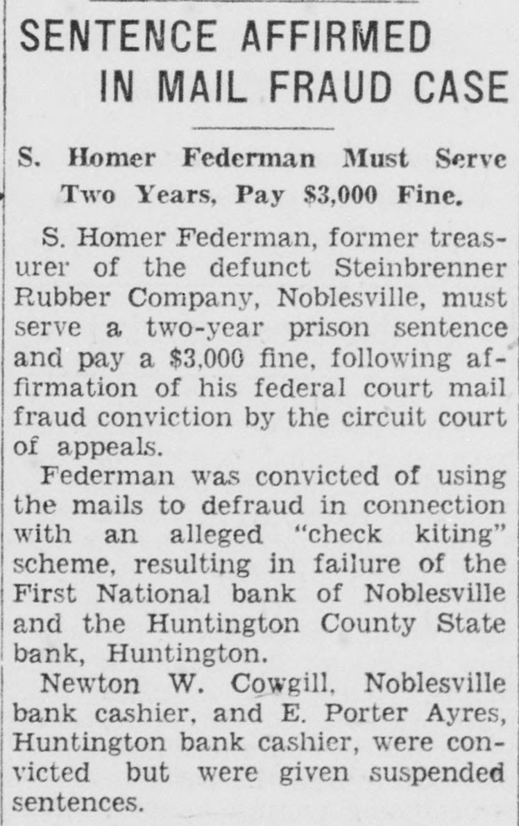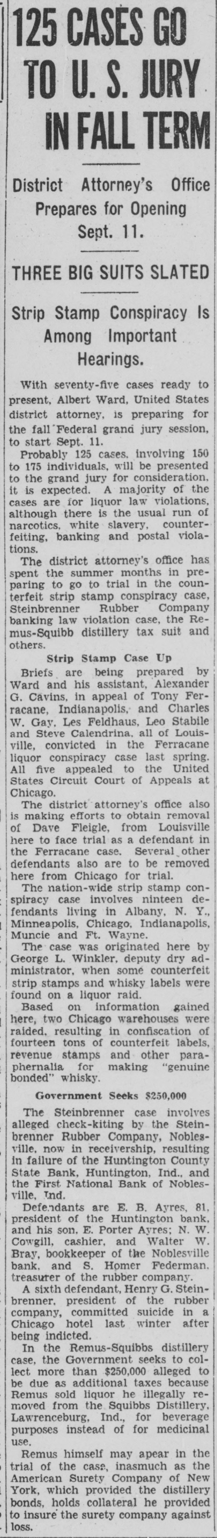 125 CASES GO TO U.S. JURY IN FALL TERM District Attorney's Office Prepares for Opening Sept. 11. THREE BIG SUITS SLATED Strip Stamp Conspiracy Is Among Important Hearings. With seventy-five cases ready to present, Albert Ward, United States district attorney, is preparing for the fall Federal grand jury session, to start Sept. 11. Probably 125 cases. involving 150 to 175 individuals, will be presented to the grand jury for consideration. it is expected. A majority of the cases are for liquor law violations, there is run of white although narcotics, slavery, the usual counterfeiting, banking and postal violations. The district attorney's office has the summer to to spent paring go trial months in the in coun- preterfeit strip stamp conspiracy case, Steinbrenner Rubber Company banking law violation case, the Remus-Squibb distillery tax suit and others. Strip Stamp Case Up Briefs are being prepared by Ward and his assistant, Alexander G. Cavins, in appeal of Tony Ferracane, Indianapolis, and Charles W. Gay, Les Feldhaus, Leo Stabile and Steve Calendrina, all of Louisville, convicted in the Ferracane liquor conspiracy case last spring. All five appealed to the United States Circuit Court of Appeals at Chicago. The district attorney's office also is making efforts to obtain removal of Dave Fleigle, from Louisville here to face trial as a defendant in the Ferracane case. Several other defendants also are to be removed here from Chicago for trial. The nation-wide strip stamp conspiracy case involves ninteen defendants living in Albany, N. Y., Minneapolis, Chicago, Indianapolis, Muncie and Ft. Wayne. The case was originated here by George L. Winkler, deputy dry administrator, when some counterfeit strip stamps and whisky labels were found on a liquor raid. Based on information gained here, two Chicago warehouses were raided. resulting in confiscation of fourteen tons of counterfeit labels, revenue stamps and other paraphernalia for making "genuine bonded" whisky. Government Seeks $250,000 The Steinbrenner case involves alleged check-kiting by the Steinbrenner Rubber Company, Noblesville, now in receivership, resulting in failure of the Huntington County State Bank, Huntington, Ind.. and the First National Bank of Noblesville, Ind. Defendants are E. B. Ayres, 81. president of the Huntington bank. and his son. E. Porter Ayres; N. W. Cowgill, cashier. and Walter W. Bray, bookkeeper of the Noblesville bank. and S. Homer Federman. treasurer of the rubber company. A sixth defendant, Henry G. Steinbrenner. president of the rubber company, committed suicide in a Chicago hotel last winter after being indicted. In the Remus-Squibbs distillery case, the Government seeks to collect more than $250,000 alleged to be due as additional taxes because Remus sold liquor he illegally removed from the Squibbs Distillery, Lawrenceburg, Ind., for beverage purposes instead of for medicinal use. Remus himself may apear in the trial of the case, inasmuch as the American Surety Company of New York, which provided the distillery bonds, holds collateral he provided to insure the surety company against loss.
