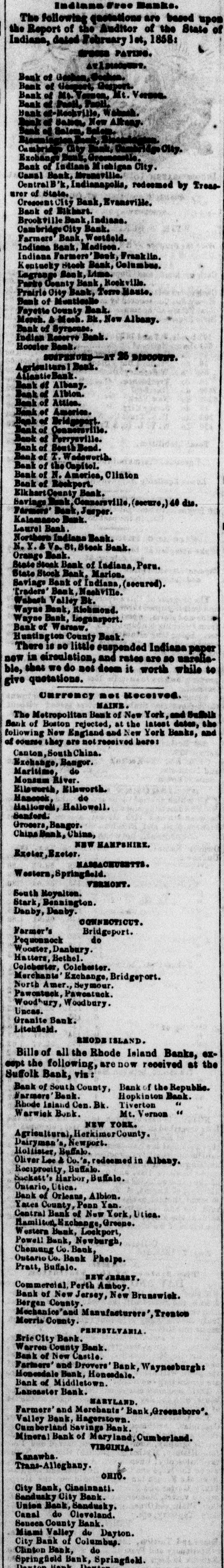 folks can only realize six, except in times like these when they can realize from five to a hundred, OVER THE LEFT. But says the friend of banks, "well regulated banks are useful"-so, we add would be a well regulated whirlwind,-take the twists out of it, and "regulate" its speed to about five miles an hour, and it would not only be harmless but very pleasant ; but it would no longer be a whirlwind, that is all() Take away from banks the power to shave-the right to take all the interest it wants-the right to"issue notes, and the right to break with those notes in the hands of poor people, and it would no longer be a bank. Some of our readers want us to give a tlist of bad banks, That would require about twice large a sheet as ours, devoted to banks alone. The New York banks are all suspended. The following are considered too bad to take, all others are current: Ingra River bank, Tonawanda. Agricultural bank, Herkimer County, Dairyman's bank, Newport, Hollister bank, Buffalo, Ontario bank, Utica. O. Lee & Co's bank, Buffalo. Bank of Orleans, Albion. Reciprocity bank, Buffalo. Sackett's Harbor bank, Buffalo, Yates County bank, Penn Yan. Tompkin's County bank, Ithaca. Huguenot bank, New Paltz, Medina bank, Medina. Troy City bank Troy. Central bank of New York, of Utica. Hamilton Exchange bank. Greene. The following Illinois banks have increased their securities, and are current: Agricultural bank: Alton bank; Bloomington bank; Central (Peoria) bank : City (of Ottawa) bank; Chicago bank; Citizen bank; Elgin bank; Edgar County bank: Farmers' and Traders' bank; Frontier bank; Galena bank: Grayv Ille bank; In. ternational bank; Lafayette bank: Marion bank; McLean County bank; Merchants' and (Drovers bank; National bank: Northern Illinois bank; Na. pierville bank; Prairie Sta to bank; Bank of Peru; Pike County bank; Quincy bank; Railroad bank: Southern (Gravville) bank; State (Shawneetown) bank; E. 1. Tinkham & Co's bank; Warren County bank. The Ohio State Banks except the following, are current now, but may not be by the time our paper reaches its readers. Dayton Bank. Sandusky City do. Clinton do. Columbus. Miami Valley do. do. Columbus. City Franklin do. Columbus. The Kentucky Banks are yet current The following Free Banks in Indiana have increased their securities and are re" garded safe. There surplus of securities, over issues of 114,999: Bank of Goshen " Gosport. Mt. Vernon. Indiana. " Paoll. " Rockville. " Salem, New Albany. : Salem, Salem. Bloomington Bank. Cambridge City do. Canal do do Crescent City do Exchange do Westfield. Farmers' do Indiana Indiana Farmsrs' de Kentucky Stock do do Lagrange do Parke County do Prairie City Salem do Goshen. Southern do of Indiana. Thy following banks are closing, but their securities are good, amounting to 7,565 above issues: Central Bank. Brookville do Bank of the Capitol. " of Elkhart. of Monticello. of Syracuse Hoosier do Indiana Stock do Huntington County do Indiana Reserve do Fayette County do Merchants & Mechanics' do The Tippecanoe Bank is under protest.