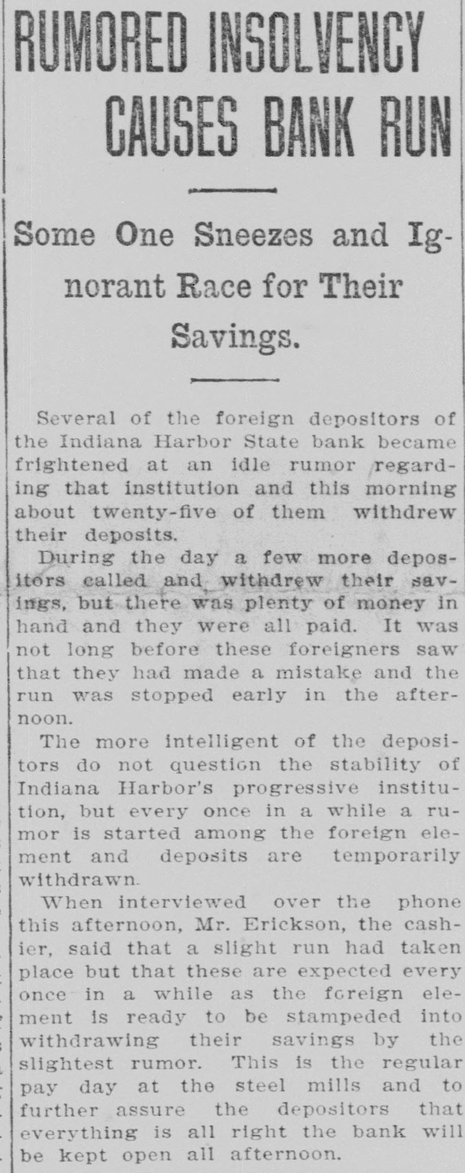 RUMORED INSOLVENCY CAUSES BANK RUN Some One Sneezes and Ignorant Race for Their Savings. Several of the foreign depositors of the Indiana Harbor State bank became frightened at an idle rumor regarding that institution and this morning about twenty-five of them withdrew their deposits. During the day a few more depositors called and withdrew their savings, but there was plenty of money in hand and they were all paid. It was not long before these foreigners saw that they had made a mistake and the run was stopped early in the afternoon. The more intelligent of the depositors do not question the stability of Indiana Harbor's progressive institution, but every once in a while a rumor is started among the foreign element and deposits are temporarily withdrawn. When interviewed over the phone this afternoon, Mr. Erickson, the cashier, said that a slight run had taken place but that these are expected every once in a while as the foreign element is ready to be stampeded into withdrawing their savings by the slightest rumor. This is the regular pay day at the steel mills and to further assure the depositors that everything is all right the bank will be kept open all afternoon.