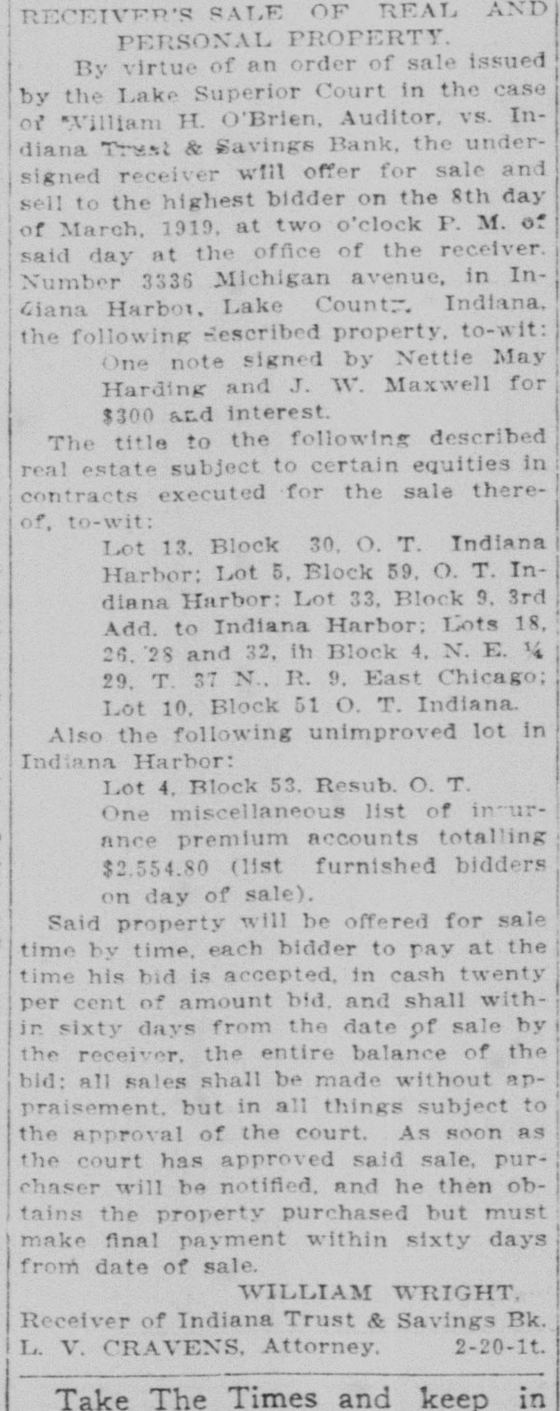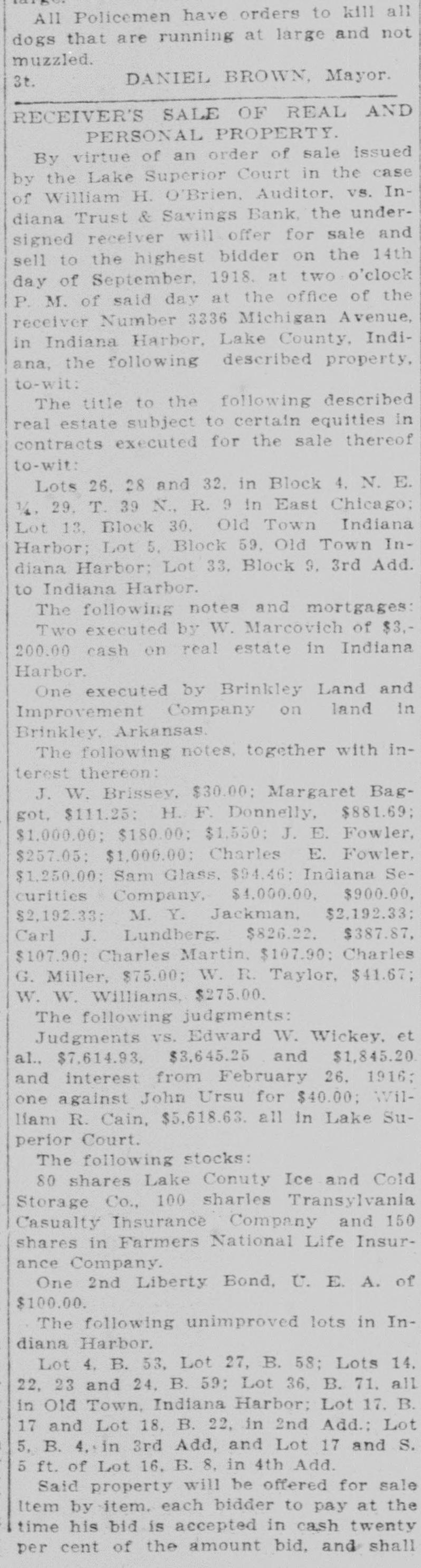 All Policemen have orders to kill all dogs that are running at large and not muzzled. DANIEL BROWN, Mayor. 3t. RECEIVER'S SALE OF REAL AND PERSONAL PROPERTY. By virtue of an order of sale issued by the Lake Superior Court in the case of William H. O'Brien, Auditor. vs. Indiana Trust & Savings Bank, the undersigned receiver will offer for sale and sell to the highest bidder on the 14th day of September, 1918. at two o'clock P. M. of said day at the office of the receiver Number 3336 Michigan Avenue, in Indiana Harbor, Lake County, Indiana, the following described property, to-wit: The title to the following described real estate subject to certain equities in contracts executed for the sale thereof to-wit: Lots 26, 28 and 32. in Block 4. N. E. 1/4, 29. T. 39 N., R. 9 in East Chicago: Lot 13, Block 30. Old Town Indiana Harbor; Lot 5. Block 59, Old Town Indiana Harbor: Lot 33, Block 9. 3rd Add. to Indiana Harbor. The following notes and mortgages: Two executed by W. Marcovich of $3,200.00 cash on real estate in Indiana Harbor. One executed by Brinkley Land and Improvement Company on land in Brinkley, Arkansas. The following notes, together with interest thereon: J. W. Brissey. $30.00; Margaret Baggot, $111.25: H. F. Donnelly, $881.69; $1,000.00; $180.00; $1,550; J. E. Fowler, $257.05: $1,000.00; Charles E. Fowler, $1,250.00; Sam Glass, $94.46: Indiana Securities Company, $4,000.00, $900.00, $2,192.33: M. Y. Jackman, $2,192.33; Carl J. Lundberg. $826.22. $387.87, $107.90: Charles Martin. $107.90; Charles G. Miller, $75.00; W. R. Taylor, $41.67; W. W. Williams, $275.00. The following judgments: Judgments vs. Edward W. Wickey. et al., $7,614.93. $3,645.25 and $1,845.20 and interest from February 26. 1916; one against John Ursu for $40.00; William R. Cain, $5,618.63. all in Lake Superior Court. The following stocks: 80 shares Lake Conuty Ice and Cold Storage Co., 100 sharles Transylvania Casualty Insurance Company and 150 shares in Farmers National Life Insurance Company. One 2nd Liberty Bond, U. E. A. of $100.00. The following unimproved lots in Indiana Harbor. Lot 4. B. 53, Lot 27, B. 58; Lots 14. 22, 23 and 24. B. 59: Lot 36, B. 71. all in Old Town, Indiana Harbor: Lot 17. B. 17 and Lot 18, B. 22, in 2nd Add.: Lot 5, B. 4, in 3rd Add, and Lot 17 and S. 5 ft. of Lot 16. B. 8, in 4th Add. Said property will be offered for sale Item by item. each bidder to pay at the time his bid is accepted in cash twenty per cent of the amount bid, and shall