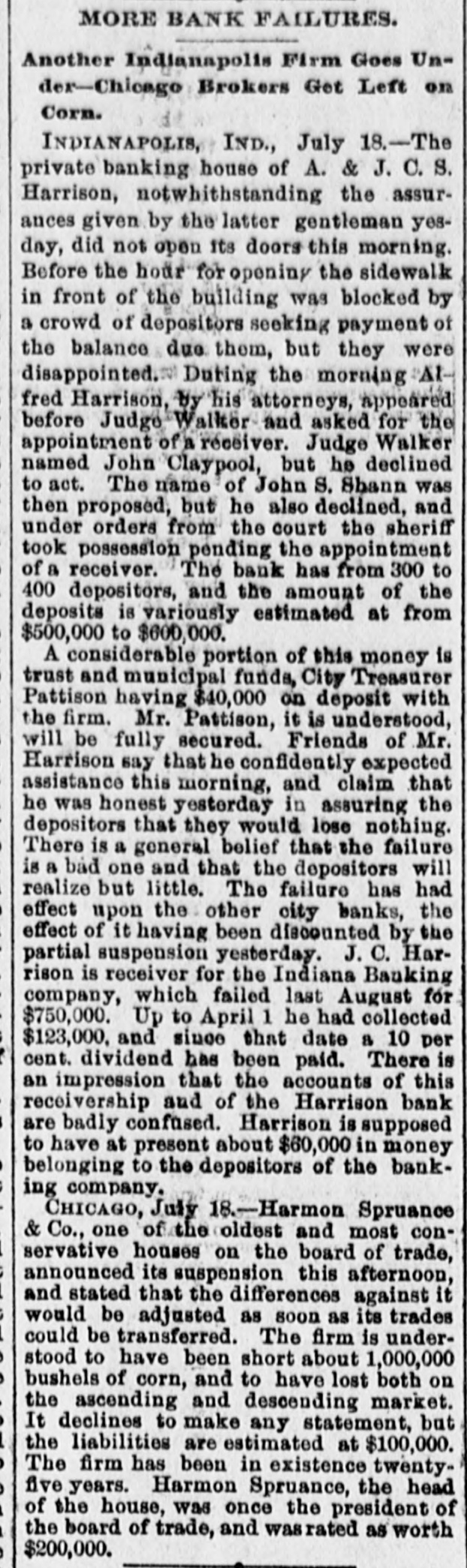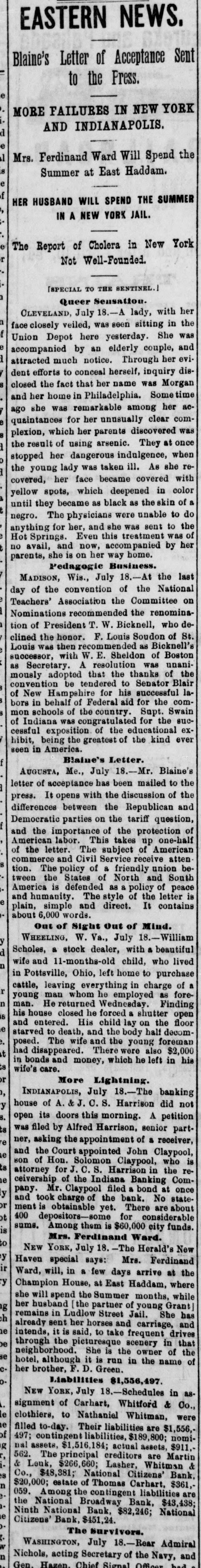 EASTERN Blaine's Letter of Acceptance Sent to the Press. MORE FAILURES IN NEW YORK AND INDIANAPOLIS. Mrs. Ferdinand Ward Will Spend the Summer at East Haddam. HER HUSBAND WILL SPEND THE SUMMER IN A NEW YORK JAIL. The Report of Cholera in New York Not Well-Founded. [SPECIAL TO THE SENTINEL.| Queer Sensation. CLEVELAND, July 18.-A lady, with her face closely veiled, was seen sitting in the Union Depot here yesterday. She was accompanied by an elderly couple, and attracted much notice. Through her evident efforts to conceal herself, inquiry disclosed the fact that her name was Morgan and her home in Philadelphia. Some time ago she was remarkable among her acquaintances for her unusually clear complexion, which her parents discovered was the result of using arsenic. They at once stopped her dangerous indulgence, when the young lady was taken ill. As she recovered, her face became covered with yellow spots, which deepened in color until they became as black as the skin of a negro. The physicians were unable to do anything for her, and she was sent to the Hot Springs. Even this treatment was of no avail, and now, accompanied by her parents, she is on her way home. Pedagogic Business. MADISON, Wis., July 18.-At the last day of the convention of the National Teachers' Association the Committee on Nominations recommended the renominstion of President T. W. Bicknell, who declined the honor. F. Louis Soudon of St. Louis was then recommended as Bicknell's successor, with W. E. Sheldon of Boston as Secretary. A resolution was unanimously adopted that the thanks of the convention be tendered to Senator Blair of New Hampshire for his successful labors in behalf of Federal aid for the common schools of the country. Supt. Swain of Indiana was congratulated for the successful exposition of the educational exhibit, being the greatest of the kind ever seen in America. Blaine's Letter. AUGUSTA, Me., July 18.-Mr. Blaine's letter of acceptance has been mailed to the press. It opens with the discussion of the differences between the Republican and Democratic parties on the tariff question, and the importance of the protection of American labor. This takes up one-half of the letter. The subject of American commerce and Civil Service receive atten tion. The policy of & friendly union between the States of North and South America is defended as a policy of peace and humanity. The style of the letter is plain, simple and direct. It contains about 6,000 words. Out of Sight Out of Mind. WHEELING, W. Va., July 18.-William Scholes, a stock dealer, with a beautiful wife and 11-months-old child, who lived in Pottsville, Ohio, left home to purchase cattle, leaving everything in charge of a young man whom he employed as foreman. He returned Wednesday. Finding his house closed he forced a shutter open and entered. His child lay on the floor starved to death, and the body half decomposed. The wife and the young foreman had disappeared. There were also $2,000 in bonds and money, which he left in his wife's care. More Lightning. INDIANAPOLIS, July 18.-The banking house of A. & J. C. S. Harrison did not open its doors this morning. A petition was filed by Alfred Harrison, senior partner, asking the appointment of & receiver, and the Court appointed John Claypool, son of Hon. Solomon Claypool, who is attorney for J. C. S. Harrison in the receivership of the Indiana Banking Company. Mr. Claypool filed a bond at once and took charge of the bank. No statement is obtainable yet. There are about 400 depositors-some for considerable sums. Among them is $60,000 city funds. Mrs. Ferdinand Ward. NEW YORK, July 18. -The Herald's New Haven special says: Mrs. Ferdinand Ward, will, in a few days arrive at the Champion House, at East Haddam, where she will spend the Summer months, while her husband the partner of young Grant] remains in Ludlow Street Jail. She has alreadv sent her horses and carriage. and