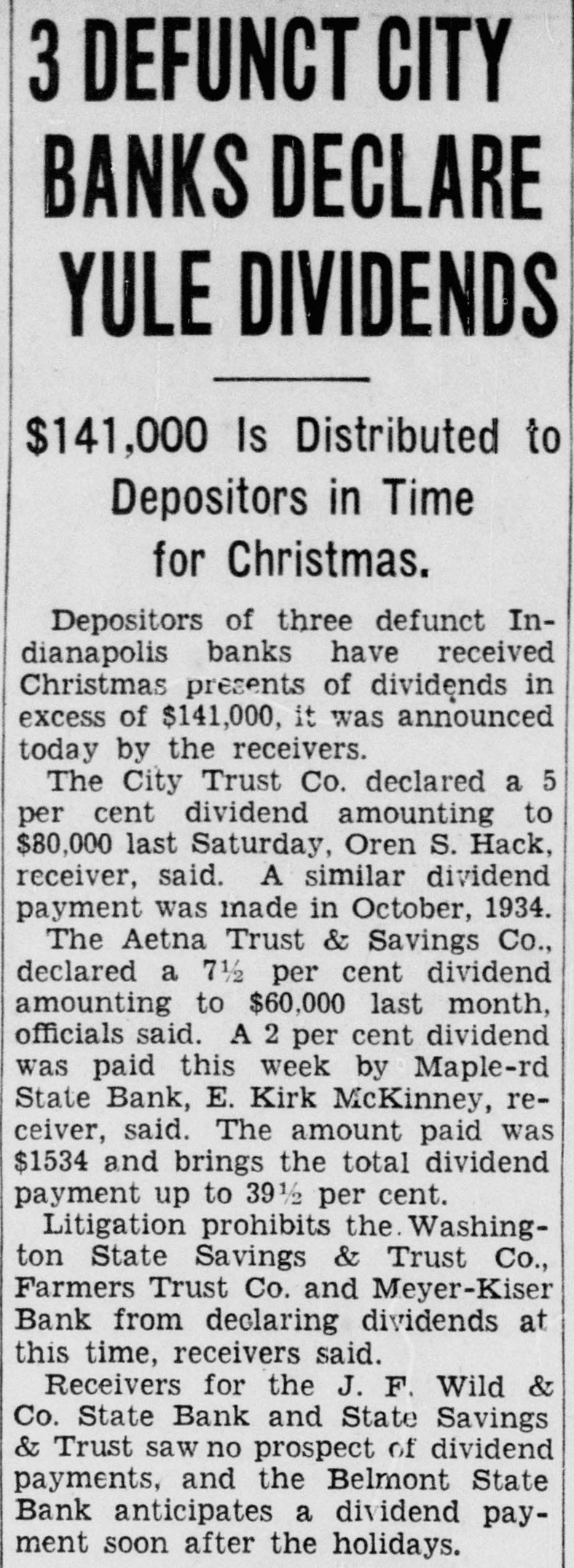3 DEFUNCT CITY BANKS DECLARE YULE DIVIDENDS $141,000 Is Distributed to Depositors in Time for Christmas. Depositors of three defunct Indianapolis banks have received Christmas presents of dividends in excess of $141,000, it was announced today by the receivers. The City Trust Co. declared a 5 per cent dividend amounting to $80,000 last Saturday, Oren S. Hack, receiver, said. A similar dividend payment was made in October, 1934. The Aetna Trust & Savings Co., declared a 7½ per cent dividend amounting to $60,000 last month, officials said. A 2 per cent dividend was paid this week by Maple-rd State Bank, E. Kirk McKinney, receiver, said. The amount paid was $1534 and brings the total dividend payment up to 39½ per cent. Litigation prohibits the. Washington State Savings & Trust Co., Farmers Trust Co. and Meyer-Kiser Bank from declaring dividends at this time, receivers said. Receivers for the J. F. Wild & Co. State Bank and State Savings & Trust saw no prospect of dividend payments, and the Belmont State Bank anticipates a dividend payment soon after the holidays.