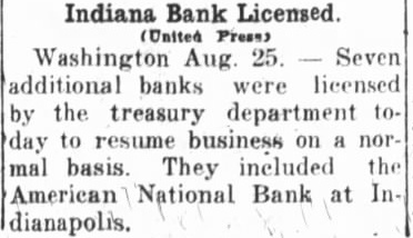 DEPOSITS ARE HEAVY AS NEW BANK STARTS Many Accounts Begun as American National Opens Doors. EXCEED WITHDRAWALS Correspondent Institutions Send Funds: Half of Deposits Freed. With heavy deposits being made and new accounts opened, the American National bank, successor to the Fletcher-American National bank, began its first day of business today. Expressing confidence in the new institution, business firms and individuals listed deposits far exceeding withdrawals. Several hundred persons transacted business in the institution today, with Indiana banks, which use the American National as a depository, sending deposits by mail throughout the day. At noon, officers estimated deposits were "several times larger than withdrawals." Official figures of the day's business were to be compiled late this afternoon, after banking hours. The bank was opened this morning at 8:30, half an hour earlier than usual, to accommodate depositors. The new institution made $8,000000 available to depositors for the first time since the institution, then the Fletcher American, was placed on a restricted basis after the national holiday. Directors and officers of the institution said they were gratified with the reception accorded opening of the bank. First deposit in the institution was® made when the Postal Telegraph and Cable Company placed funds in the new bank. At 3 Wednesday, assets of the old bank were released by Frank C. Bopp, conservator. No formalities attended the opening, in line with the order of James C. Rogan, new president, who said he believed the fact that the institution was ready for business would be sufficient. With opening of the downtown bank, the branch institution at Forty-second street and College avenue again offered a complete service to depositors.