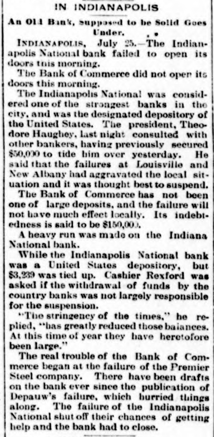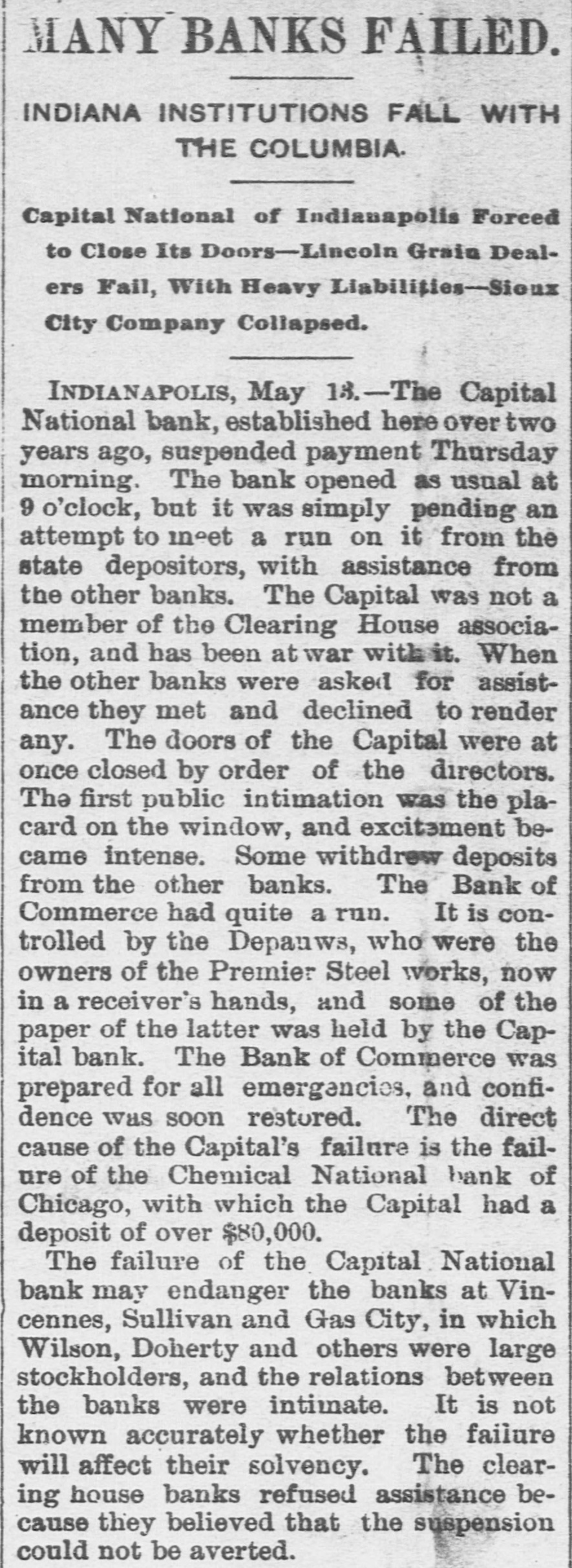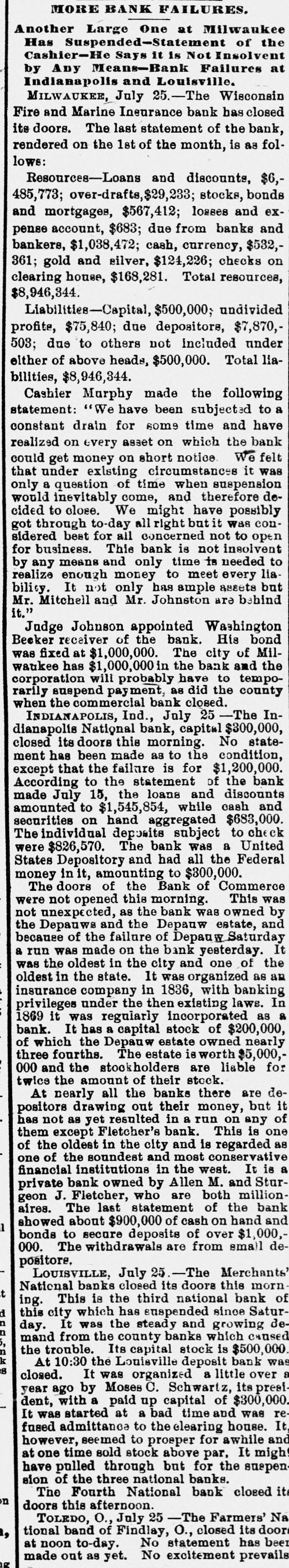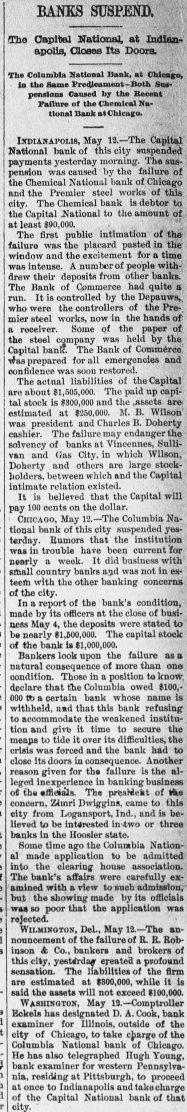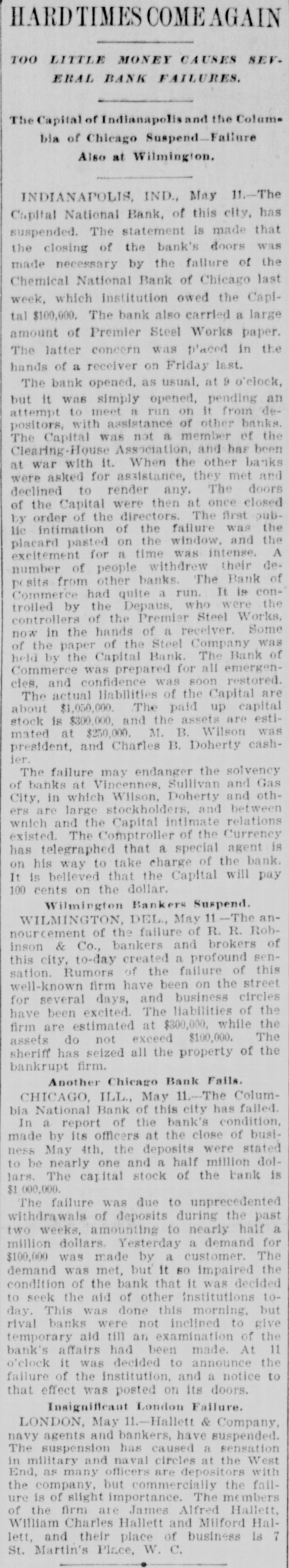 HARDTIMES COMEAGAIN TOO LITTLE MONEY CAUSES SEV. ERAL BANK FAILURES. The Capital of Indianapolis and the Colume bia of Chicago Suspend Failure Also at Wilmington. INDIANAPOLIS IND., May 11.-The Capital National Bank, of this city, has suspended. The statement is made that the closing of the bank's doors was made necessary by the failure of the Chemical National Bank of Chicago last week, which institution owed the Capital $100,000. The bank also carried a large amount of Premier Steel Works paper. The latter concern was Placed in the hands of a receiver on Friday last. The bank opened, as usual, at 9 o'clock, but it was simply opened, pending an attempt to meet a run on it from depositors, with assistance of other banks The Capital was not a member of the Clearing-House Association, and has been at war with it. When the other banks were asked for assistance, they met and declined to render any. The doors of the Capital were then at once closed by order of the directors. The first public intimation of the failure was the placard pasted on the window. and the excitement for a time was intense. A number of people withdrew their deposits from other banks. The Bank of Commerce had quite a run. It is controlled by the Depaus, who were the controllers of the Premier Steel Works, now in the hands of a receiver. Some of the paper of the Steel Company was held by the Capital Bank. The Bank of Commerce was prepared for all emergencles. and confidence was soon restored. The actual liabilities of the Capital are about $1,050,000. The paid up capital stock is $300,000. and the assets are estimated at $250,000. M. B. Wilson was president, and Charles B. Doherty cashier. The failure may endanger the solvency of banks at Vincennes, Sullivan and Gas City, in which Wilson, Doherty and others are large stockholders, and between which and the Capital intimate relations existed. The Comptroller of the Currency has telegraphed that a special agent is on his way to take charge of the bank. It is believed that the Capital will pay 100 cents on the dollar. Wilmington Bankers Suspend. WILMINGTON DEL. May 11-The annourcement of the failure of R. R. Robinson & Co., bankers and brokers of this city, to-day created a profound sensation. Rumors of the failure of this well-known firm have been on the street for several days, and business circles have been excited. The liabilities of the firm are estimated at $300,000. while the assets do not exceed $100,000. The sheriff has seized all the property of the bankrupt firm. Another Chicago Bank Fails. CHICAGO, ILL., May --The Columbia National Bank of this city has failed. In a report of the bank's condition, made by its officers at the close of business May 4th, the deposits were stated to be nearly one and a half million dollars. The capital stock of the bank is $1,000,000. The failure was due to unprecedented withdrawals of deposits during the past two weeks, amounting to nearly half a million dollars Yesterday a demand for $100,000 was made by a customer. The demand was met, but it so impaired the condition of the bank that it was decided to seek the aid of other institutions today. This was done this morning, but rival banks were not inclined to give temporary aid till an examination of the bank's affairs had been made. At 11 o'clock it was decided to announce the failure of the institution, and a notice to that effect was posted on its doors. Insignificant London Failure. LONDON, May 11.-Hallett & Company, navy agents and bankers, have suspended. The suspension has caused a sensation in military and naval circles at the West End, as many officers are depositors with the company, but commercially the failure is of slight importance. The members of the firm are James Alfred Hallett, William Charles Hallett and Milford Hallett, and their place of business Is 7 St. Martin's Place, W. C.