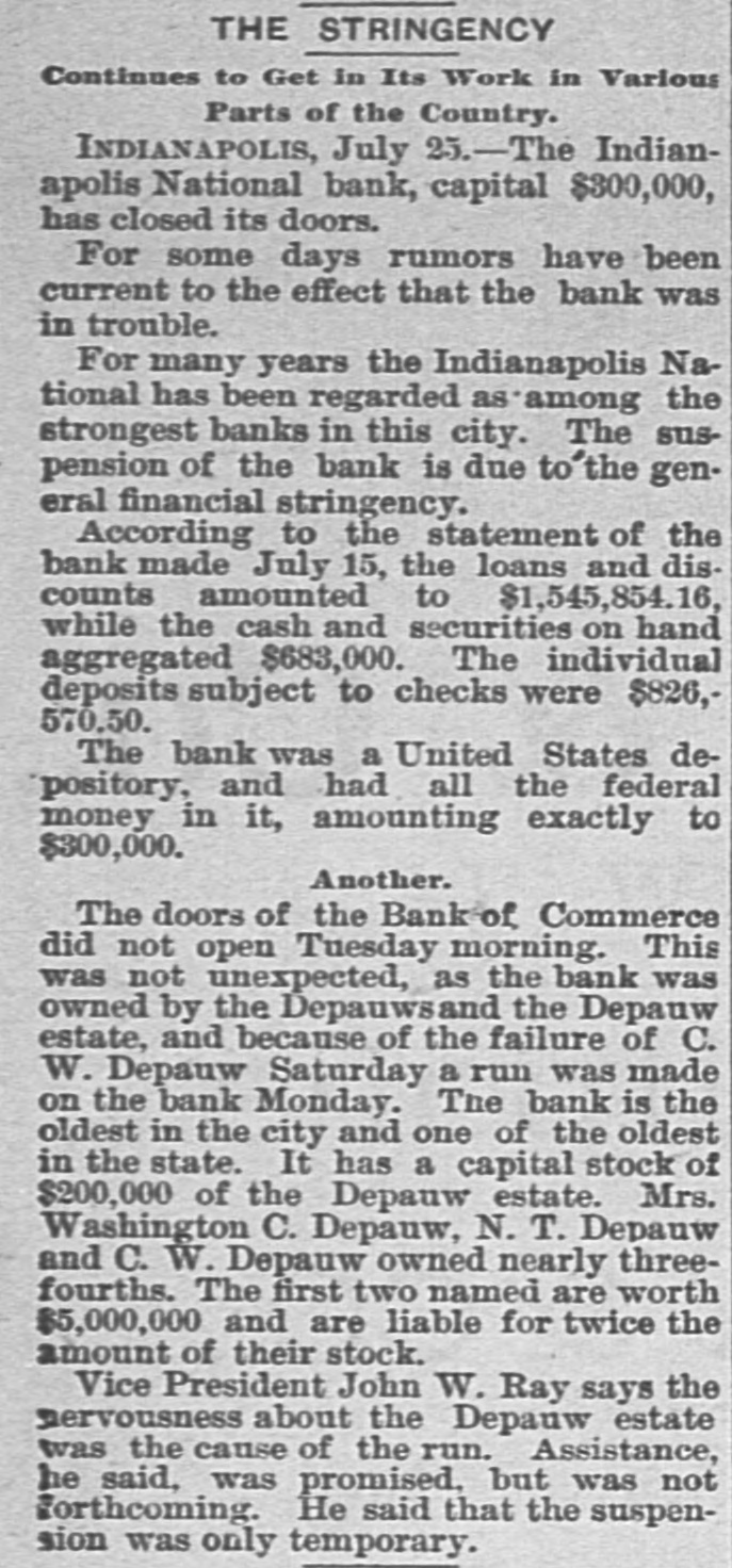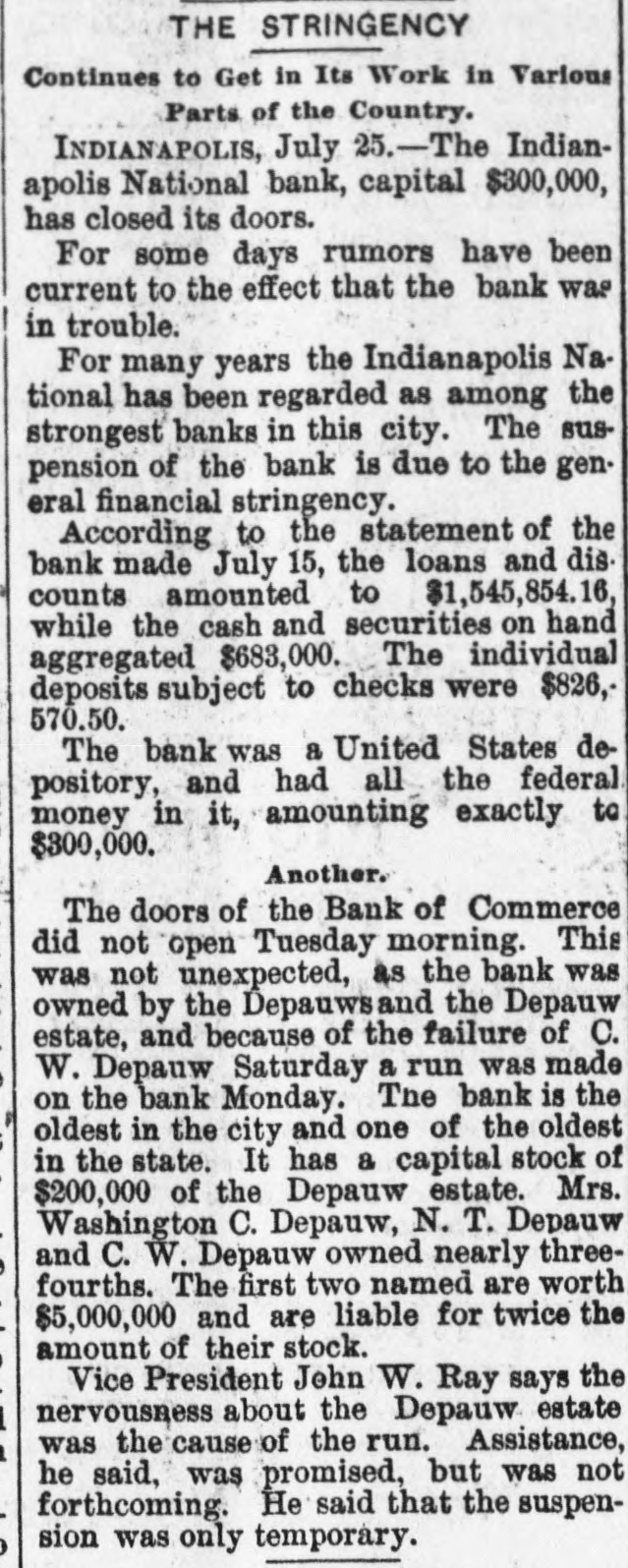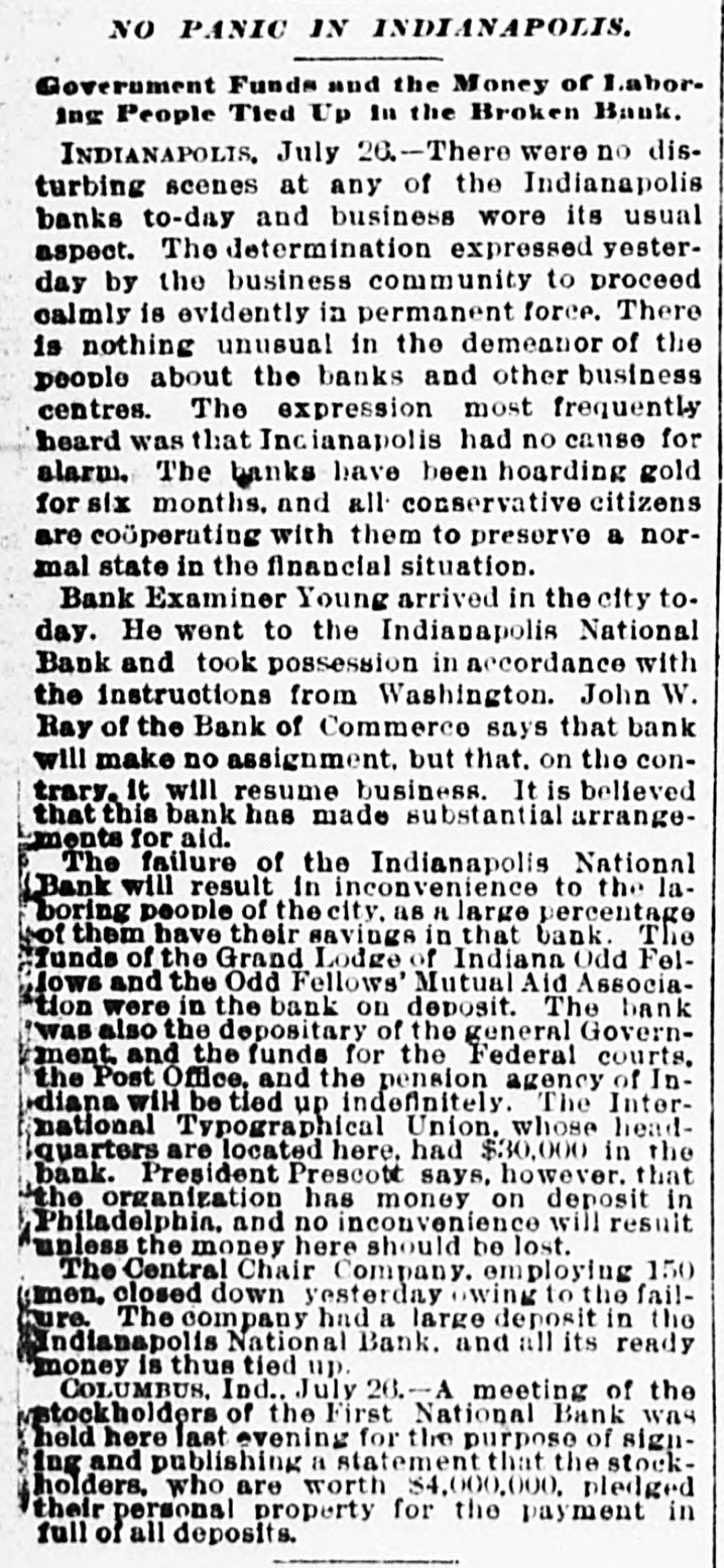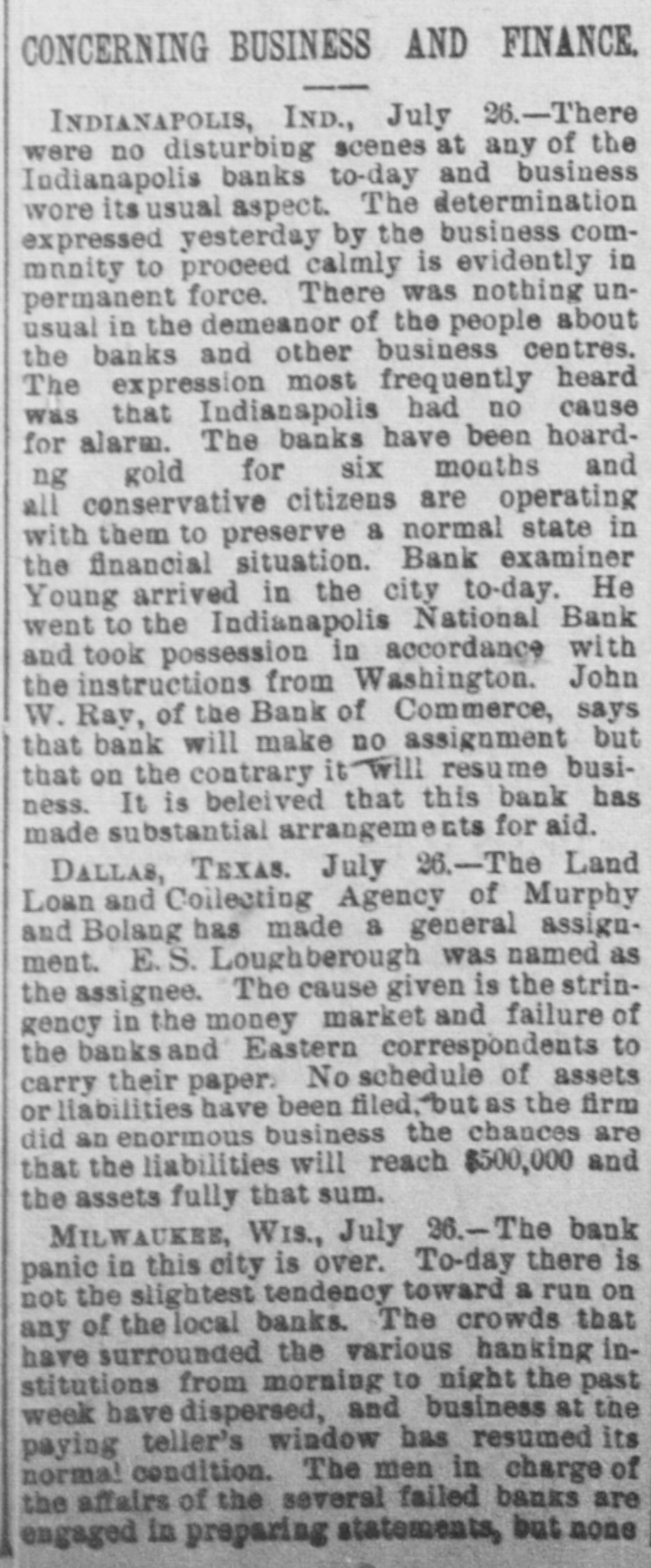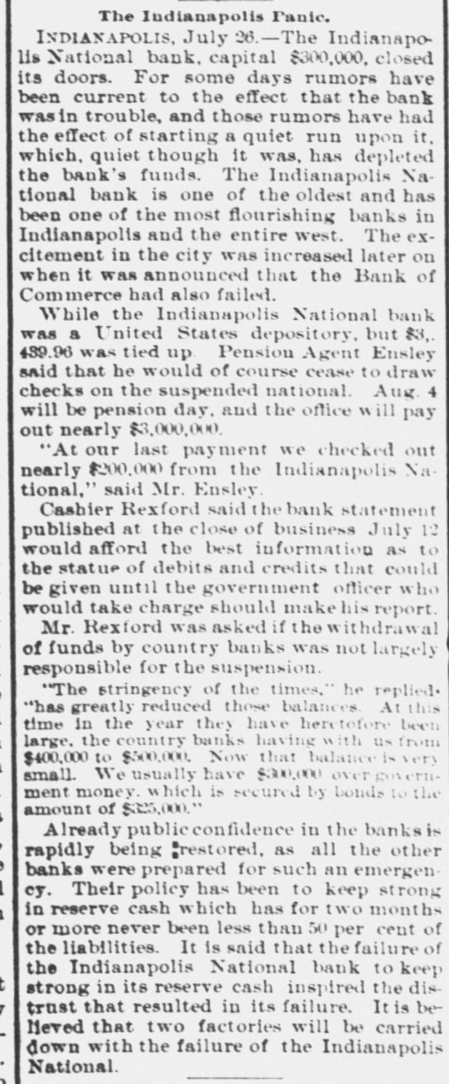 HARDTIMES COMEAGAIN TOO LITTLE MONEY CAUSES SEV. ERAL BANK FAILURES. The Capital of Indianapolis and the Colume bia of Chicago Suspend Failure Also at Wilmington. INDIANAPOLIS IND., May 11.-The Capital National Bank, of this city, has suspended. The statement is made that the closing of the bank's doors was made necessary by the failure of the Chemical National Bank of Chicago last week, which institution owed the Capital $100,000. The bank also carried a large amount of Premier Steel Works paper. The latter concern was Placed in the hands of a receiver on Friday last. The bank opened, as usual, at 9 o'clock, but it was simply opened, pending an attempt to meet a run on it from depositors, with assistance of other banks The Capital was not a member of the Clearing-House Association, and has been at war with it. When the other banks were asked for assistance, they met and declined to render any. The doors of the Capital were then at once closed by order of the directors. The first public intimation of the failure was the placard pasted on the window. and the excitement for a time was intense. A number of people withdrew their deposits from other banks. The Bank of Commerce had quite a run. It is controlled by the Depaus, who were the controllers of the Premier Steel Works, now in the hands of a receiver. Some of the paper of the Steel Company was held by the Capital Bank. The Bank of Commerce was prepared for all emergencles. and confidence was soon restored. The actual liabilities of the Capital are about $1,050,000. The paid up capital stock is $300,000. and the assets are estimated at $250,000. M. B. Wilson was president, and Charles B. Doherty cashier. The failure may endanger the solvency of banks at Vincennes, Sullivan and Gas City, in which Wilson, Doherty and others are large stockholders, and between which and the Capital intimate relations existed. The Comptroller of the Currency has telegraphed that a special agent is on his way to take charge of the bank. It is believed that the Capital will pay 100 cents on the dollar. Wilmington Bankers Suspend. WILMINGTON DEL. May 11-The annourcement of the failure of R. R. Robinson & Co., bankers and brokers of this city, to-day created a profound sensation. Rumors of the failure of this well-known firm have been on the street for several days, and business circles have been excited. The liabilities of the firm are estimated at $300,000. while the assets do not exceed $100,000. The sheriff has seized all the property of the bankrupt firm. Another Chicago Bank Fails. CHICAGO, ILL., May --The Columbia National Bank of this city has failed. In a report of the bank's condition, made by its officers at the close of business May 4th, the deposits were stated to be nearly one and a half million dollars. The capital stock of the bank is $1,000,000. The failure was due to unprecedented withdrawals of deposits during the past two weeks, amounting to nearly half a million dollars Yesterday a demand for $100,000 was made by a customer. The demand was met, but it so impaired the condition of the bank that it was decided to seek the aid of other institutions today. This was done this morning, but rival banks were not inclined to give temporary aid till an examination of the bank's affairs had been made. At 11 o'clock it was decided to announce the failure of the institution, and a notice to that effect was posted on its doors. Insignificant London Failure. LONDON, May 11.-Hallett & Company, navy agents and bankers, have suspended. The suspension has caused a sensation in military and naval circles at the West End, as many officers are depositors with the company, but commercially the failure is of slight importance. The members of the firm are James Alfred Hallett, William Charles Hallett and Milford Hallett, and their place of business Is 7 St. Martin's Place, W. C.