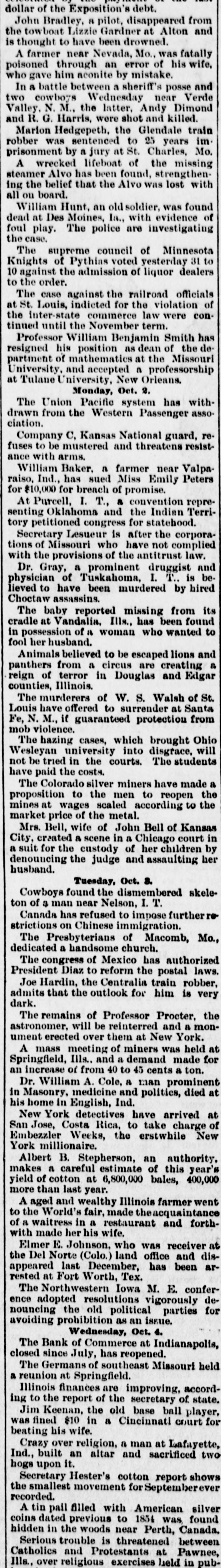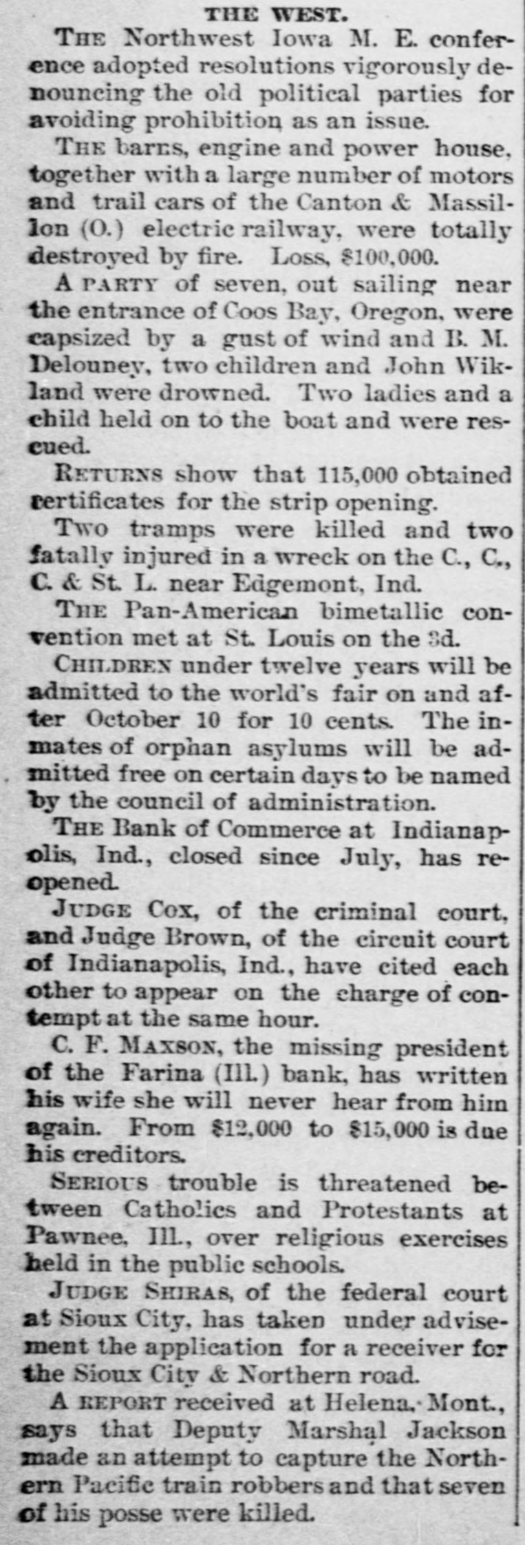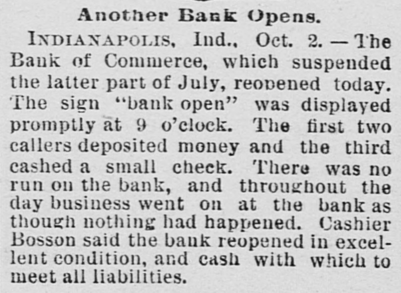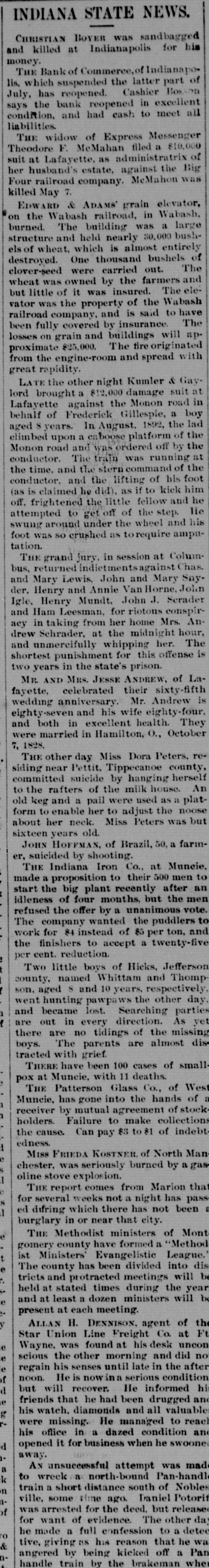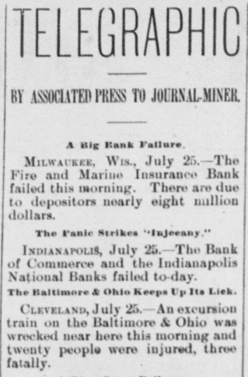 HARDTIMES COMEAGAIN TOO LITTLE MONEY CAUSES SEV. ERAL BANK FAILURES. The Capital of Indianapolis and the Colume bia of Chicago Suspend Failure Also at Wilmington. INDIANAPOLIS IND., May 11.-The Capital National Bank, of this city, has suspended. The statement is made that the closing of the bank's doors was made necessary by the failure of the Chemical National Bank of Chicago last week, which institution owed the Capital $100,000. The bank also carried a large amount of Premier Steel Works paper. The latter concern was Placed in the hands of a receiver on Friday last. The bank opened, as usual, at 9 o'clock, but it was simply opened, pending an attempt to meet a run on it from depositors, with assistance of other banks The Capital was not a member of the Clearing-House Association, and has been at war with it. When the other banks were asked for assistance, they met and declined to render any. The doors of the Capital were then at once closed by order of the directors. The first public intimation of the failure was the placard pasted on the window. and the excitement for a time was intense. A number of people withdrew their deposits from other banks. The Bank of Commerce had quite a run. It is controlled by the Depaus, who were the controllers of the Premier Steel Works, now in the hands of a receiver. Some of the paper of the Steel Company was held by the Capital Bank. The Bank of Commerce was prepared for all emergencles. and confidence was soon restored. The actual liabilities of the Capital are about $1,050,000. The paid up capital stock is $300,000. and the assets are estimated at $250,000. M. B. Wilson was president, and Charles B. Doherty cashier. The failure may endanger the solvency of banks at Vincennes, Sullivan and Gas City, in which Wilson, Doherty and others are large stockholders, and between which and the Capital intimate relations existed. The Comptroller of the Currency has telegraphed that a special agent is on his way to take charge of the bank. It is believed that the Capital will pay 100 cents on the dollar. Wilmington Bankers Suspend. WILMINGTON DEL. May 11-The annourcement of the failure of R. R. Robinson & Co., bankers and brokers of this city, to-day created a profound sensation. Rumors of the failure of this well-known firm have been on the street for several days, and business circles have been excited. The liabilities of the firm are estimated at $300,000. while the assets do not exceed $100,000. The sheriff has seized all the property of the bankrupt firm. Another Chicago Bank Fails. CHICAGO, ILL., May --The Columbia National Bank of this city has failed. In a report of the bank's condition, made by its officers at the close of business May 4th, the deposits were stated to be nearly one and a half million dollars. The capital stock of the bank is $1,000,000. The failure was due to unprecedented withdrawals of deposits during the past two weeks, amounting to nearly half a million dollars Yesterday a demand for $100,000 was made by a customer. The demand was met, but it so impaired the condition of the bank that it was decided to seek the aid of other institutions today. This was done this morning, but rival banks were not inclined to give temporary aid till an examination of the bank's affairs had been made. At 11 o'clock it was decided to announce the failure of the institution, and a notice to that effect was posted on its doors. Insignificant London Failure. LONDON, May 11.-Hallett & Company, navy agents and bankers, have suspended. The suspension has caused a sensation in military and naval circles at the West End, as many officers are depositors with the company, but commercially the failure is of slight importance. The members of the firm are James Alfred Hallett, William Charles Hallett and Milford Hallett, and their place of business Is 7 St. Martin's Place, W. C.