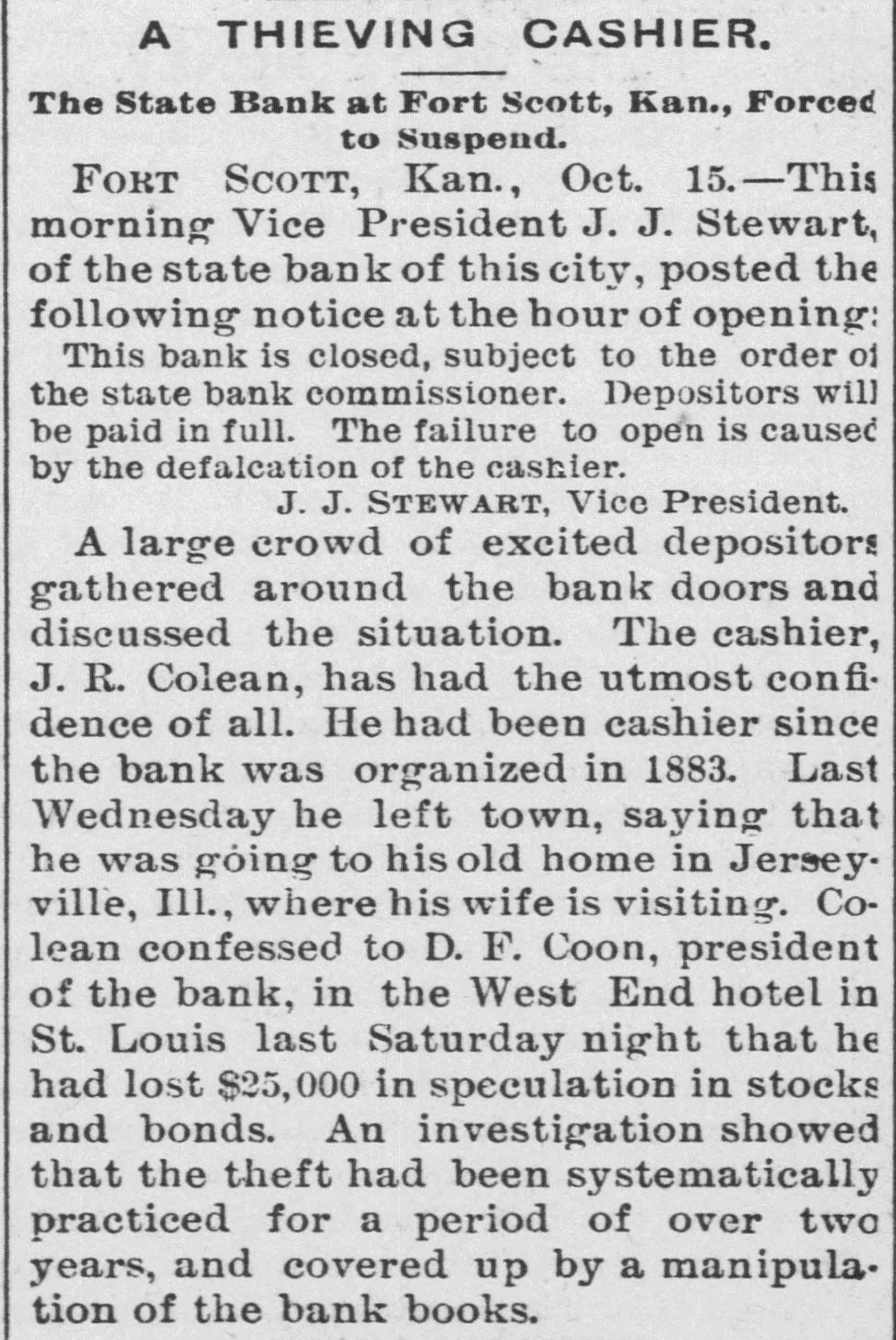 A THIEVING CASHIER. The State Bank at Fort Scott, Kan., Forced to suspend. FORT SCOTT, Kan., Oct. 15.-This morning Vice President J. J. Stewart, of the state bank of this city, posted the following notice at the hour of opening: This bank is closed, subject to the order of the state bank commissioner. Depositors will be paid in full. The failure to open is caused by the defalcation of the cashier. J. J. STEWART, Vice President. A large crowd of excited depositors gathered around the bank doors and discussed the situation. The cashier, J. R. Colean, has had the utmost confidence of all. He had been cashier since the bank was organized in 1883. Last Wednesday he left town, saying that he was going to his old home in Jerseyville, III., where his wife is visiting. Colean confessed to D. F. Coon, president of the bank, in the West End hotel in St. Louis last Saturday night that he had lost $25,000 in speculation in stocks and bonds. An investigation showed that the theft had been systematically practiced for a period of over two years, and covered up by a manipulation of the bank books.