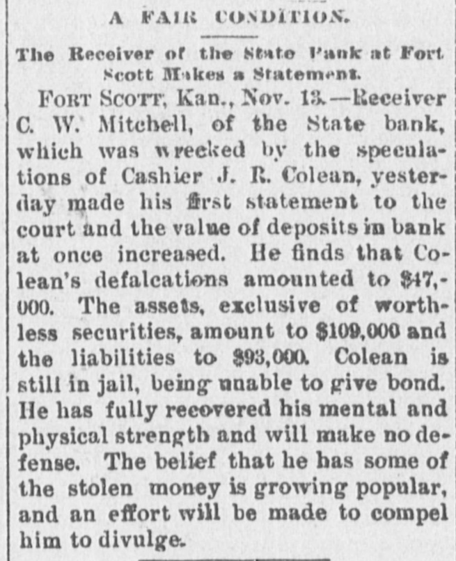 A FAIR CONDITION. The Receiver of the State Pank at Fort Scott Makes a Statement. FORT SCOTT, Kan., Nov. 13-Receiver C. W. Mitchell, of the State bank, which was wreeked by the speculations of Cashier J. R. Colean, yesterday made his first statement to the court and the value of deposits in bank at once increased. He finds that Colean's defalcations amounted to $47,000. The assets, exclusive of worthless securities, amount to $109,000 and the liabilities to $93,000. Colean is still in jail, being nnable to give bond. He has fully recovered his mental and physical strength and will make no defense. The belief that he has some of the stolen money is growing popular, and an effort will be made to compel him to divulge.