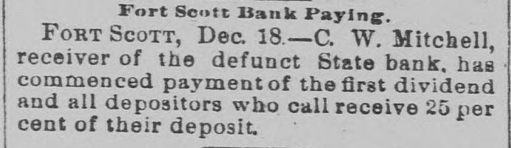 Fort Scott Bank Paying. FORT ScoTT, Dec. 18.-C. W. Mitchell, receiver of the defunct State bank. has commenced payment of the first dividend and all depositors who call receive 25 per cent of their deposit.