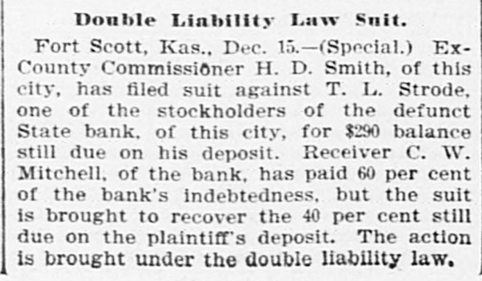 Double Liability Law Suit. Fort Scott, Kas., Dec. 15.-(Special.) ExCounty Commissioner H. D. Smith, of this city, has filed suit against T. L. Strode, one of the stockholders of the defunct State bank, of this city, for $290 balance still due on his deposit. Receiver C. W. Mitchell, of the bank, has paid 60 per cent of the bank's indebtedness, but the suit is brought to recover the 40 per cent still due on the plaintiff's deposit. The action is brought under the double liability law.