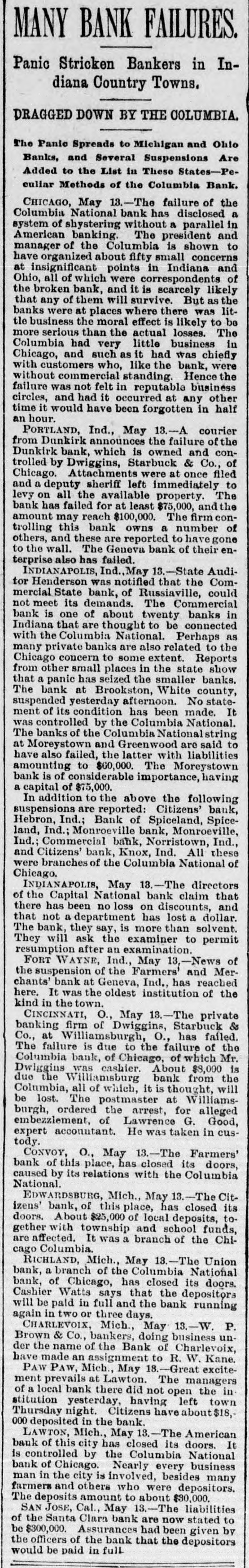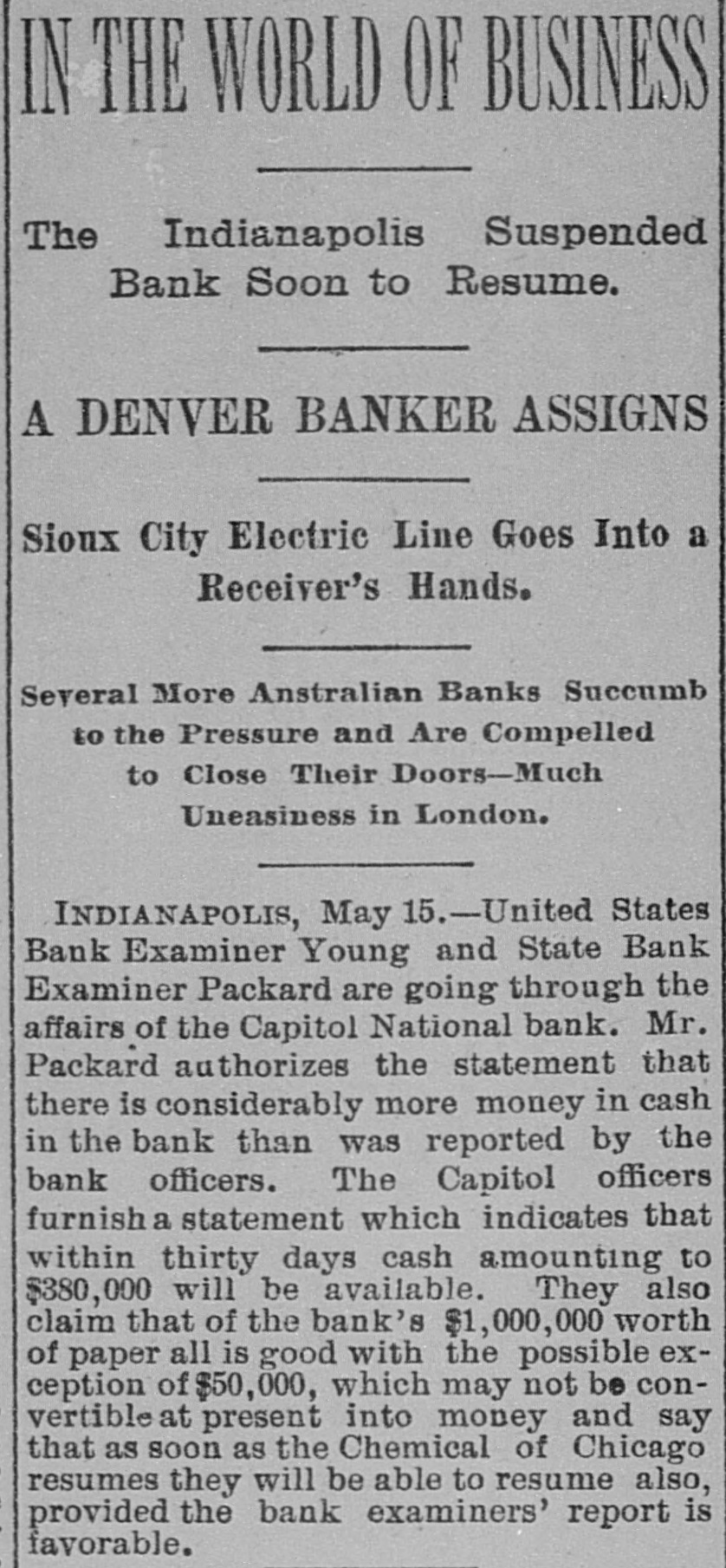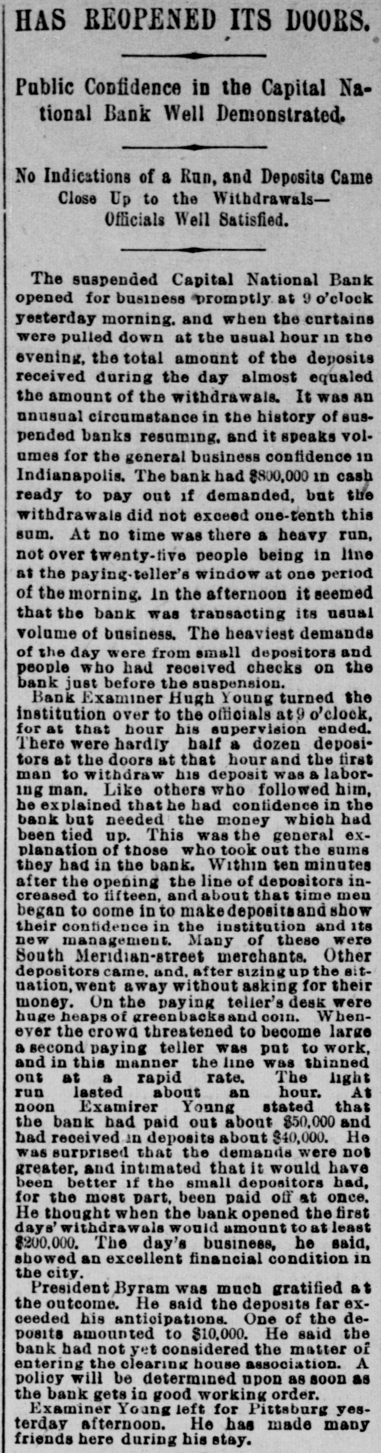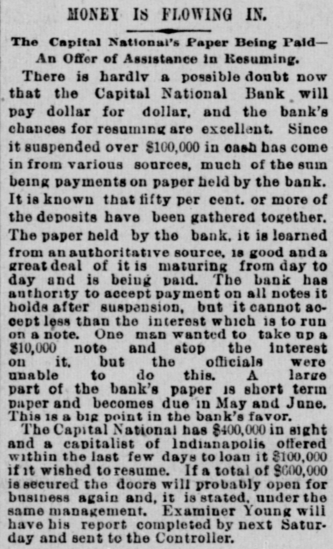 THE MONEY TRANSFERRED Otto Frenzel Goes to the Capital Bank and Demands Iron Hall Money. Receiver Failey Gives Him a Check on the Capital for $140,000-No Notification Had Been Given, but the Money WasThere. It is not very often that a man walks into a bank, without a moment's warning, in the busiest part of the day, and asks the paying-teller to cash a $140,000 check, but that is what was done at the Capital National Bank yesterday. The man with the check was Otto Frenzel, and the check was drawn by Receiver Failey, of the Iron Hall, and was for that order's funds which the Capital Bank held. Mr. Frenzel got the money in cold cash. It was three trips that the paying teller made to the big vault, and each time he would pile up greenback. in five-thousanddollar packages, on his arm like cord wood, and dump it on his desk. Mr. Frenzel was obliged to send for assistance to carry it to his bank, but it was gotten over without accident, and Receiver Failey has it where he can put his fingers on it. A Journal reporter called on President Wilson late last evening, and questioned him as to the occurrence. "The demand was wholly unexpected by us, but we were perfectly able to meet it," he said. I have talked to Mr. Failey but once since his appointment, and that was immediately after it. He said then that he should want to transfer the money some time, but that he could not tell how soon, and that he would letme know. We have had no word since, but have thought it best to be prepared." Wasn't it a very unusual proceeding, Mr. Wilson?" was asked. "Well. yes," and the banker smiled cautionsly. "It wasn't just exactly business courtesy, was it?" "No; I shouldn't have asked them for such a sum without first sending them word. and asking them if it were convenient for them to pay it, and I don't believe one banker in ten would have done it." "Would they have closed you up. if you hadn't happened to have the money?" "I've no doubt of it." Mr. Wilson went on to say that he was at the telier's window when Mr. Frenzel called for the money. and that he was of the opinion that Mr. Frenzel was considerably surprised when the money was counted out to him. He had no explanation to offer for such an action on the part of the Frenzel bank. but had all the appearances of a man well pleased with himself for having defeated a scheme that might have worked some harm to him. When the conversation turned on generalities he made the remark that it was very peculiar how John Frenzel tried to ride rough-shod over everyone, and then said: "Well, he never will over me." in a tone that said as plain as words: "And he didn't do it to-day." It could not be learned last night whether any of the Iron Hall's funds had been drawn from any of the other banks or not, but it 18 believed that there has not. Attorney Hawkins was seen by a reporter and was informed of the withdrawal of the money from the Capital Bank. He refused to believe it, and it was not until he was told that the reporter had conversed with President Wilson about it he reluctantly admitted its truth. He then expressed the profoundest surprise that such a thing had been done. "I am sure that I bad no knowledge of it, and from a less authentic source should most positively refuse to believe it. As attorneys we have no control over Receiver Failey, and I can give no explanation of the affair."