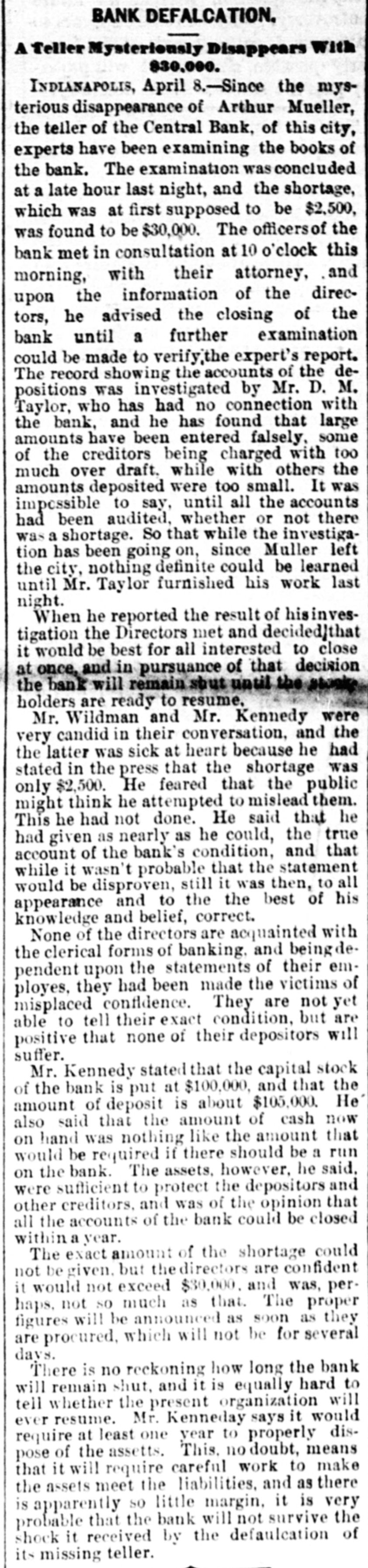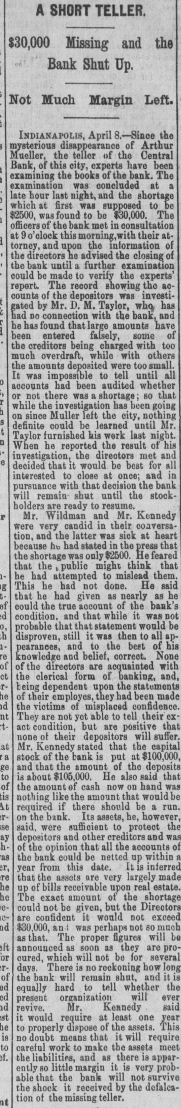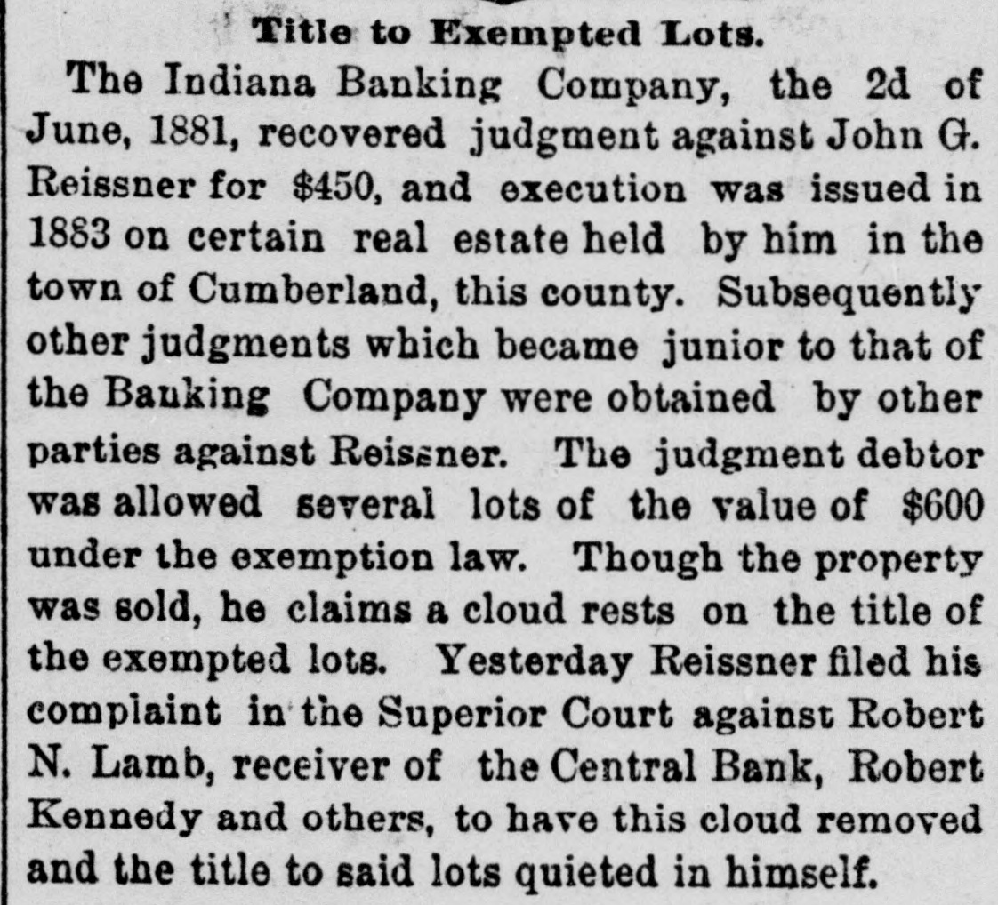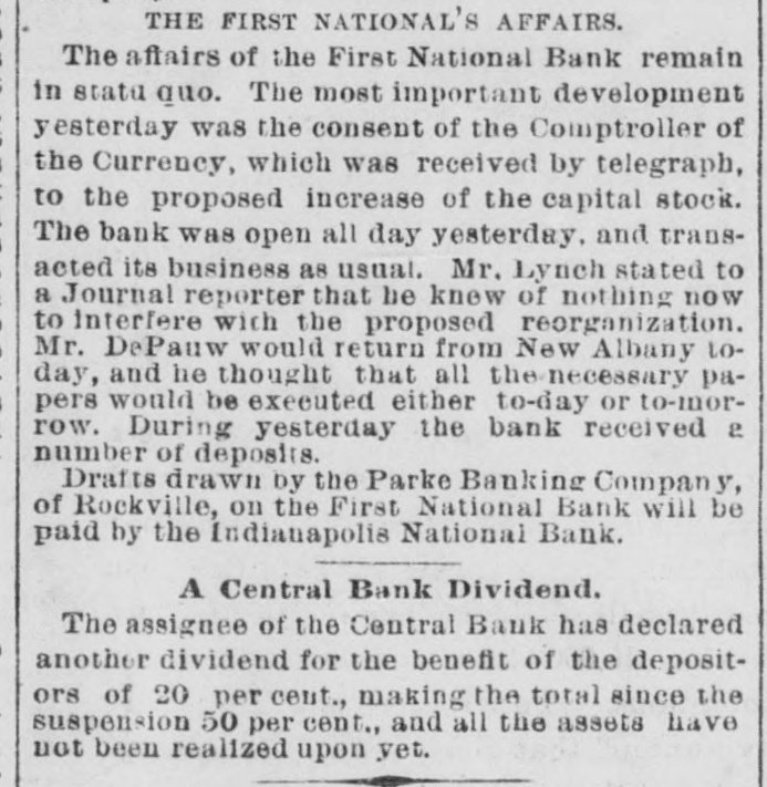THE FINANCIAL OUTLOOK. Judge Robert N. Lamb Appointed Receiver for Mr. Harrison's Bank. The Real Condition of Its Affairs Yet Unknown-The Proposed Plan for Reorganizing Fletcher & Sharpe's. Upon petition of numerous depositors, Judge Walker, of the Superior Court, on Saturday ap pointed Judge Robert N. Lamb receiver of Harrison's Bank, fixing his bond at $100,000, a reduction of $200,000 from the amount originally proposed. Judge Lamb consented to accept the trust, and during the afternoon gave the required bond, his sureties being I. N. Pattison, N. N. Morris, W. G. Wasson, J. E. Robertson and Ralph Hill. The appointment gives general satisfaction, for Mr. Lamb is known to be a man of excellent judgment and ability. He is at present receiver of the Central Bank, whose failure was at the time thought to be most disastrous. He managed its affairs so admirably that he has already paid 75 cents on the dollar, and he is now about to declare an additional dividend of 10 per cent. Judge Lamb took possession of Harrison's bank Saturday evening, and an examination of the vaults showed that the amount of cash on hand was just $63.25, mostly in nickels and other fractional currency. Mr. Lamb will this morning begin an examination of the books and papers, and he thinks he will be able to make public a statement of assets and liabilities by to morrow or Wednesday. Mr. Harrison still declines to make any statement to the reporters. MORE LEGAL PROCEEDINGS. On Saturday afternoon an amended complaint was filed by Alfred Harrison in the SuperiorCourt, reciting the facts set forth in the petition for the appointment of a receiver and setting forth in addition that he is the owner in his individual right of certain real and personal property and that the defendant, John C.S. Harrison, is the owner in his individual right of certain real and personal property, that the partnership assets of the firm are not sufficient to pay their liabilities, wherefore the plaintiff surrenders all his individual property, saving the amount legally exempt from execution, and asks the court to take possession of the property by the receiver and apply it to the payment of the partnership debts in the same manner as the receiver takes possession of the assets of the partnership. The complaint further avers that the plaintiff is informed and believes that the defendant, John C. S. Harrison, is willing to surrender his individual property for the payment of partnership debts of the firm, and the plaintiff asks that the defendant be required to answer the complaint, and in case he consents to such surrender of his individual property, the court to direct the receiver to take possession of the individal property of the defendant in the same manner and for the same purpose as that of the plaintiff. To this an answer was formally made by J. C. S. Harrison, admitting the allegations made. Later in the day three mortgages were placed on record by the Harrisons, conveying the residence property of Alfred and John C. S. Har rison and the Parker Block on North Delaware street. They are executed to Charles Mayer, William Haueisen, William Haerle. George W Stout and George Mannfeldt, sureties on John C.S. Harrison's bond as receiver of the Indiana Banking Company, for the purpose, as stated, 'to secure and indemnify the mortgagees against any and all loss on account of their liability as sureties of John C. S. Harrison, re ceiver of the banking company, and to secure the mortgages on account of any money they may be required to pay as such sureties. The mortgage on the Parker Block is also "to secure the mortgagees against any indebtedness of Alfred and J. C. S. Harrison. PROPOSED REORGANIZATION OF FLETCHER & SHARPE, Exclusive mention was made in the Journal of Saturday of the proposed scheme to reorganize Fletcher & Sharpe's Bank, which is meeting with much favor from depositors, and there now seems to be a probability of its consummation. The plan of reorganization is detailed as follows in a circular sent out to depositors: It is very desirable, and unquestionably to the interest of all depositors in the bank of Fletcher & Sharpe, that their affairs be taken out of the hands of the court, and the bank continue business. and to this end it is now proposed to form stock company, under the name of Fletcher & Sharpe's Banking Company. each depositor being stockholder to the amount of his or her deposit, and with limited liabil ity, Messrs. Fletcher and Sharpe holding all stock above the amount due to depositors This will make a bank with capital of about $1,750,000 paid up and out of debt. The plan is as follows: 1. Fletcher & Sharpe convey to said company all of their real estate and turn over, also, all notes, bills, cash and other assets. now held by the receiver, estimated to amount to $1 800,000. 2. The depositors hold stock to the amount due them, being about 1,550,000, leaving $250,000 for Fletcher & Sharpe. 3. The said banking company to be managed by a board of directors, to be composed of nine members, four of whom shall be the members of the firm of Fletcher & Sharpe, who shall continue in charge of the details of the business, and the remaining five, elected by the depositors, as their representatives; this management to continue for five years. The advantage of this plan would be: 1. Saving of cost of litigation, lawyers's fees, forcing of real estate on the market at an unfavorable time, and sacrifice of assets as IS always the case under receivership, because, the bank being entirely out of debt, would have ample time to convert its assets, instead of being compelled to sell, in order to close such large estate. 2. Each depositor being a stockholder. would be interested in the success of the bank, and by continuing his or her business at the bank, in which he or she would then be interested would be adding to the profits of the institution, by providing funds with which to make discounts and accommodate borrowers. 3. The sale