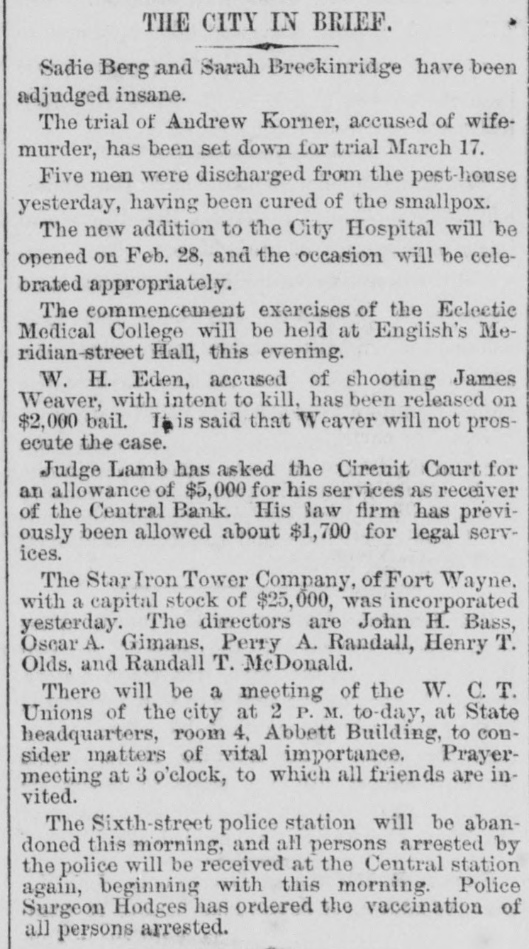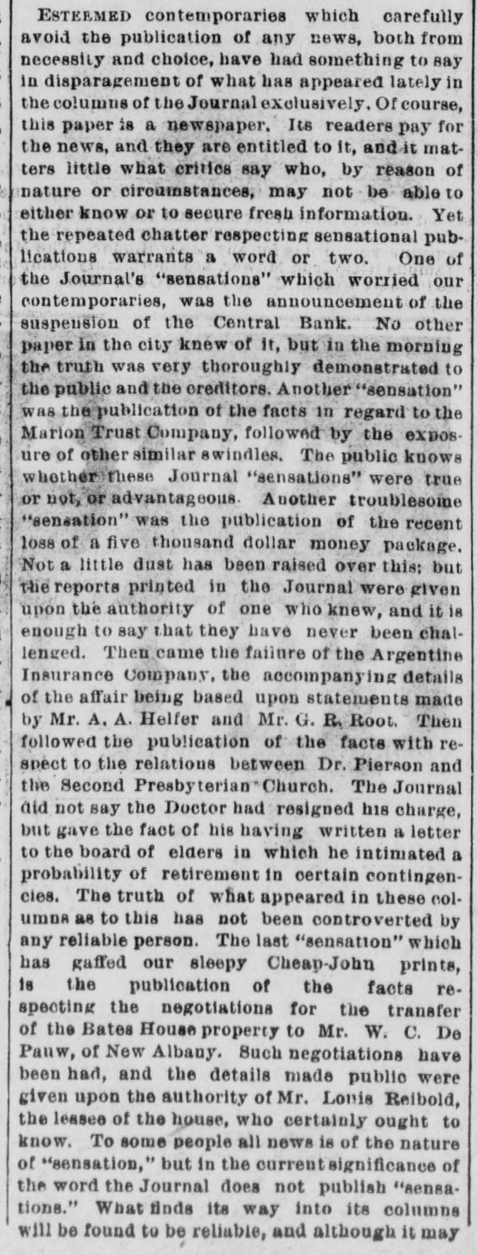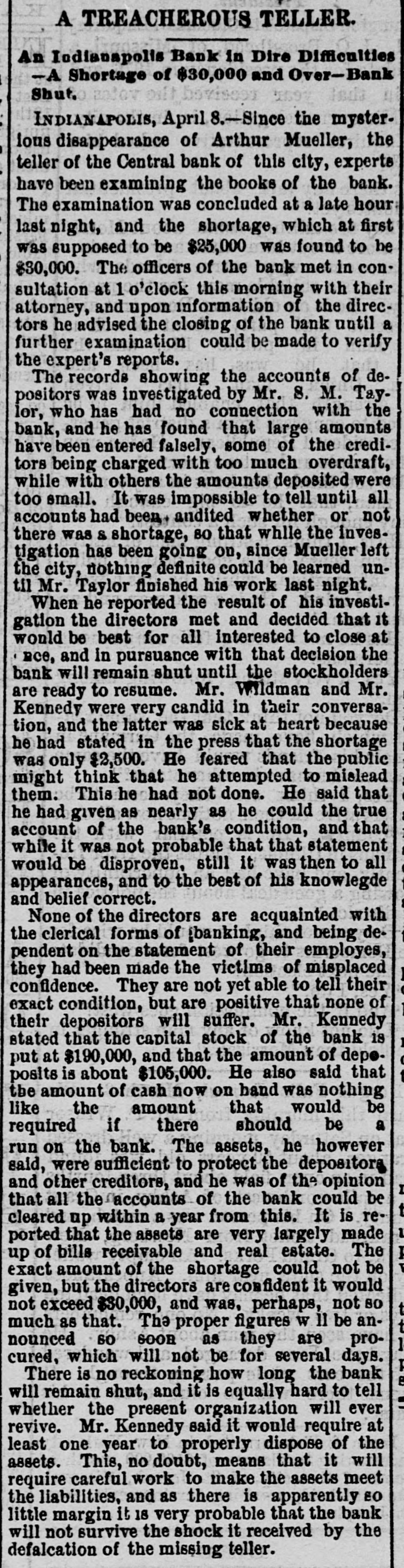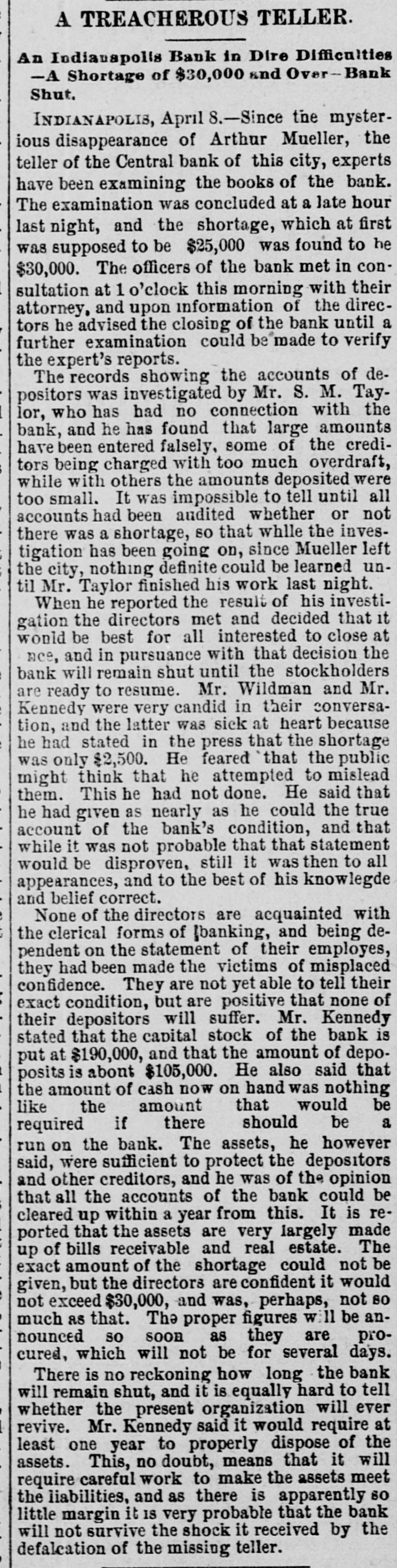 THE FINANCIAL OUTLOOK. Judge Robert N. Lamb Appointed Receiver for Mr. Harrison's Bank. The Real Condition of Its Affairs Yet Unknown-The Proposed Plan for Reorganizing Fletcher & Sharpe's. Upon petition of numerous depositors, Judge Walker, of the Superior Court, on Saturday ap pointed Judge Robert N. Lamb receiver of Harrison's Bank, fixing his bond at $100,000, a reduction of $200,000 from the amount originally proposed. Judge Lamb consented to accept the trust, and during the afternoon gave the required bond, his sureties being I. N. Pattison, N. N. Morris, W. G. Wasson, J. E. Robertson and Ralph Hill. The appointment gives general satisfaction, for Mr. Lamb is known to be a man of excellent judgment and ability. He is at present receiver of the Central Bank, whose failure was at the time thought to be most disastrous. He managed its affairs so admirably that he has already paid 75 cents on the dollar, and he is now about to declare an additional dividend of 10 per cent. Judge Lamb took possession of Harrison's bank Saturday evening, and an examination of the vaults showed that the amount of cash on hand was just $63.25, mostly in nickels and other fractional currency. Mr. Lamb will this morning begin an examination of the books and papers, and he thinks he will be able to make public a statement of assets and liabilities by to morrow or Wednesday. Mr. Harrison still declines to make any statement to the reporters. MORE LEGAL PROCEEDINGS. On Saturday afternoon an amended complaint was filed by Alfred Harrison in the SuperiorCourt, reciting the facts set forth in the petition for the appointment of a receiver and setting forth in addition that he is the owner in his individual right of certain real and personal property and that the defendant, John C.S. Harrison, is the owner in his individual right of certain real and personal property, that the partnership assets of the firm are not sufficient to pay their liabilities, wherefore the plaintiff surrenders all his individual property, saving the amount legally exempt from execution, and asks the court to take possession of the property by the receiver and apply it to the payment of the partnership debts in the same manner as the receiver takes possession of the assets of the partnership. The complaint further avers that the plaintiff is informed and believes that the defendant, John C. S. Harrison, is willing to surrender his individual property for the payment of partnership debts of the firm, and the plaintiff asks that the defendant be required to answer the complaint, and in case he consents to such surrender of his individual property, the court to direct the receiver to take possession of the individal property of the defendant in the same manner and for the same purpose as that of the plaintiff. To this an answer was formally made by J. C. S. Harrison, admitting the allegations made. Later in the day three mortgages were placed on record by the Harrisons, conveying the residence property of Alfred and John C. S. Har rison and the Parker Block on North Delaware street. They are executed to Charles Mayer, William Haueisen, William Haerle. George W Stout and George Mannfeldt, sureties on John C.S. Harrison's bond as receiver of the Indiana Banking Company, for the purpose, as stated, 'to secure and indemnify the mortgagees against any and all loss on account of their liability as sureties of John C. S. Harrison, re ceiver of the banking company, and to secure the mortgages on account of any money they may be required to pay as such sureties. The mortgage on the Parker Block is also "to secure the mortgagees against any indebtedness of Alfred and J. C. S. Harrison. PROPOSED REORGANIZATION OF FLETCHER & SHARPE, Exclusive mention was made in the Journal of Saturday of the proposed scheme to reorganize Fletcher & Sharpe's Bank, which is meeting with much favor from depositors, and there now seems to be a probability of its consummation. The plan of reorganization is detailed as follows in a circular sent out to depositors: It is very desirable, and unquestionably to the interest of all depositors in the bank of Fletcher & Sharpe, that their affairs be taken out of the hands of the court, and the bank continue business. and to this end it is now proposed to form stock company, under the name of Fletcher & Sharpe's Banking Company. each depositor being stockholder to the amount of his or her deposit, and with limited liabil ity, Messrs. Fletcher and Sharpe holding all stock above the amount due to depositors This will make a bank with capital of about $1,750,000 paid up and out of debt. The plan is as follows: 1. Fletcher & Sharpe convey to said company all of their real estate and turn over, also, all notes, bills, cash and other assets. now held by the receiver, estimated to amount to $1 800,000. 2. The depositors hold stock to the amount due them, being about 1,550,000, leaving $250,000 for Fletcher & Sharpe. 3. The said banking company to be managed by a board of directors, to be composed of nine members, four of whom shall be the members of the firm of Fletcher & Sharpe, who shall continue in charge of the details of the business, and the remaining five, elected by the depositors, as their representatives; this management to continue for five years. The advantage of this plan would be: 1. Saving of cost of litigation, lawyers's fees, forcing of real estate on the market at an unfavorable time, and sacrifice of assets as IS always the case under receivership, because, the bank being entirely out of debt, would have ample time to convert its assets, instead of being compelled to sell, in order to close such large estate. 2. Each depositor being a stockholder. would be interested in the success of the bank, and by continuing his or her business at the bank, in which he or she would then be interested would be adding to the profits of the institution, by providing funds with which to make discounts and accommodate borrowers. 3. The sale