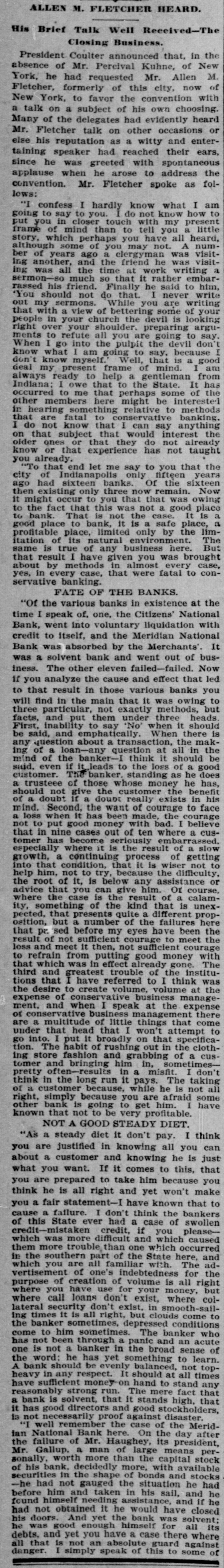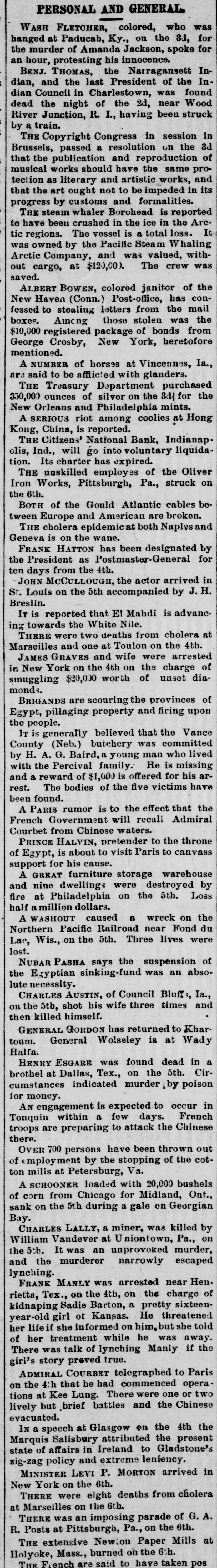 PERSONAL AND GENERAL WASH FLETCHER, colored, who was hanged at Paducab, Ky., on the 33, for the murder of Amanda Jackson, spoke for an hour, protesting his innocence. BENJ. THOMAS, the Narragansett Indian, and the last President of the Indian Council in Charlestown, was found dead the night of the 2d, near Wood River Junction, R. I., having been struck by train. THE Copyright Congress in session in Brussels, passed a resolution on the 3d that the publication and reproduction of musical works should have the same protection as literary and artistic works, and that the art ought not to be impeded in its progress by customs and formalities. THE steam whaler Borohead is reported to have been crushed in the ice in the Arctic regions. The vessel is a total loss. It was owned by the Pacific Steam Whaling Arctic Company, and was valued, withwas out cargo, at $120,00). The crew saved. ALBERT BOWEN, colored janitor of the New Haven (Conn.) Post-office, has confessed to stealing letters from the mail boxes. Among those stolen was the $10,000 registered package of bonds from George Crosby, New York, heretofore mentioned. A NUMBER of horses at Vincennes, Ia., are said to be afflicted with glanders. THE Treasury Department purchased 350,000 ounces of silver on the 3d{ for the New Orleans and Philadelphia mints, A SERIOUS riot among coolies at Hong Kong, China, is reported. THE Citizens' National Bank, Indianap olis, Ind., will go into voluntary liquidation. Its charter has expired. THE unskilled employes of the Oliver Iron Works, Pittsburgh, Pa., struck on the 6th. BOTH of the Gould Atlantic cables between Europe and American are broken. THE cholera epidemicat both Naplesan Geneva is on the wane. FRANK HATTON has been designated by the President as Postmaster-General for ten days from the 4th. JOHN McCULLOUGH, the actor arrived in St. Louis on the 5th accompanied by H. Breslin. Ir is reported that El Mahdi is advancing towards the White Nile. THERE were two deaths from cholera at Marseilles and one at Toulon on the 4th. JAMES GRAVES and wife were arrested in New York on the 4th on the charge of smuggling $20,000 worth of unset diamonds. BRIGANDS are scouring the provinces of Egypt, pillaging property and firing upon the people. IT is generally believed that the Vance was by A. a man lived with County H. the (Neb.) Percival G. Baird, butchery family. young He committed is who missing and a reward of $1,000 is offered for his arrest. The bodies of the five victims have been found. A PARIS rumor is to the effect that the French Government will recall Admiral Courbet from Chinese waters. PRINCE HALVIN, pretender to the throne of Egypt, is about to visit Paris to canvass support for his cause. A GREAT furniture storage warehouse and nine dwellings were destroyed by fire at Philadelphia on the 5th. Loss half a million dollars. A WASHOUT caused a wreck on the Northern Pacific Railroad near Fond du Lac, Wis., on the 5th. Three lives were lost. NUBAR PASHA says the suspension of the Egyptian sinking-fund was an absolute necessity. CHARLES AUSTIN, of Council Bluff:, Ia., on the 5tb, shot his wife three times and then killed himself. GENERAL GORDON has returned to Khartoum. General Wo!seley is at Wady Halfa. a HENRY ESGARE was found dead in brothel at Dallas, Tex., on the 5th. Circumstances indicated murder by poison for money. AN engagement is expected to occur in Tonquin within a few days. French troops are preparing to attack the Chinese there. OVER 700 persons have been thrown out of employment by the stopping of the cotton mills at Petersburg, Va. A SCHOONER loaded with 20,000 bushels of corn from Chicago for Midland, Ont., sank on the 5th during a gale on Georgian Bay. CHARLES LALLY, a miner, was killed by William Vandever at Uniontown, Pa., on the 5th. It was an unprovoked murder, and the murderer narrowly escaped lynching. FRANK MANLY was arrested near Henrietta, Tex., on the 4th, on the charge of kidnaping Sadie Barton, a pretty sixteenyear-old girl ot Kansas. He threatened her life if she informed on him, but she told of her treatment while he was away. There was talk of lynching Manly if the girl's story preved true. ADMIRAL COURBET telegraphed to Paris on the 4:h that he had commenced operations at Kee Lung. There were one or two lively but brief battles and the Chinese evacuated. IN a speech at Glasgow on the 4th the Marquis Salisbury attributed the present state of affairs in Ireland to Gladstone's zig-zag policy and extreme leniency. MINISTER LEVI P. MORTON arrived in New York on the 6th. THERE were eight deaths from cholera at Marseilles on the 6th. THERE was an imposing parade of G. A. R. Posts at Pittsburgh, Pa., on the 6th. THE extensive Newton Paper Mills at Holyoke, Mass., burned on the 6th. THE French are said to have taken pos